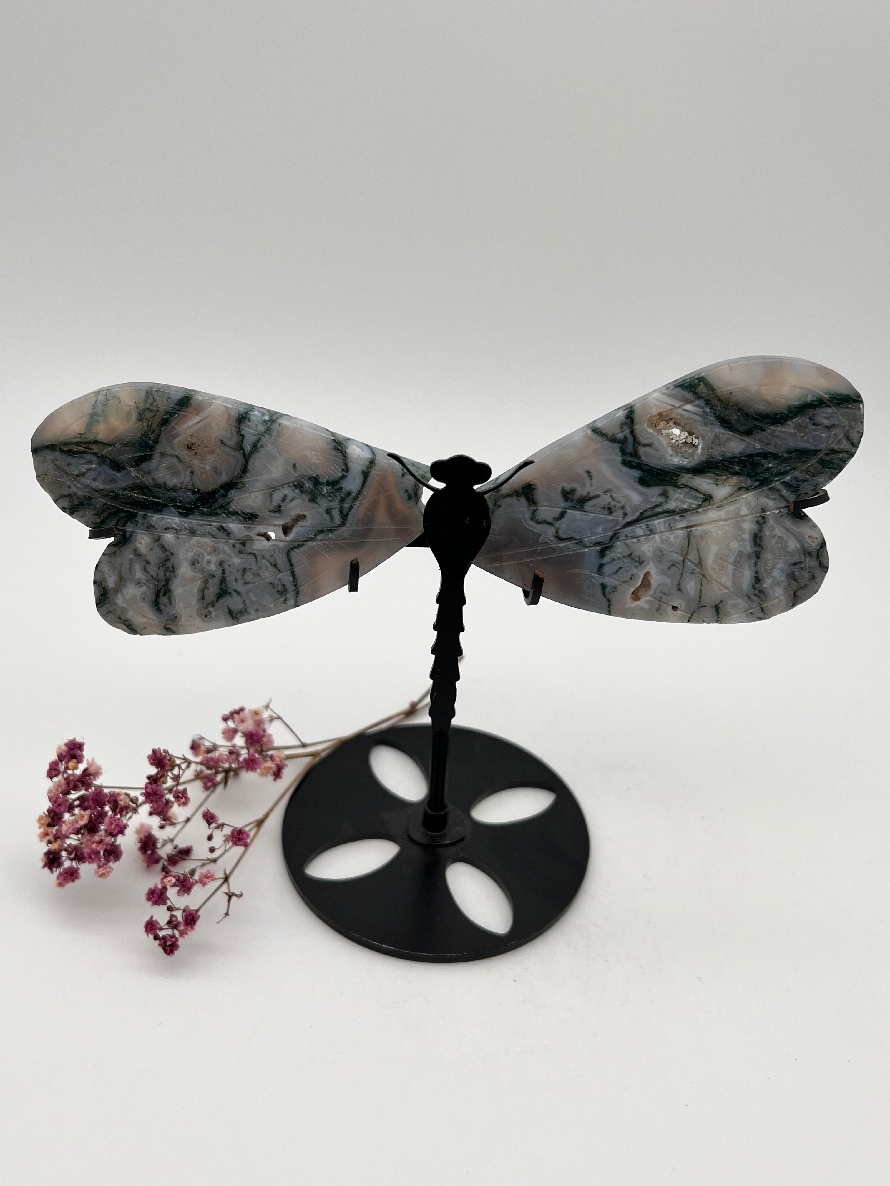 Diese feine Libelle aus Baumachat steht für den leichten Wandel und die Rückverbindung zur Natur. Baumachat wirkt beruhigend, stärkt das Vertrauen in Lebenszyklen und unterstützt sanfte Heilungsprozesse – körperlich wie emotional. Die Libelle als Krafttier symbolisiert Transformation, Leichtigkeit und das Überwinden alter Grenzen. Gemeinsam erinnern sie dich daran, dass Wachstum auch sanft und liebevoll sein darf.
