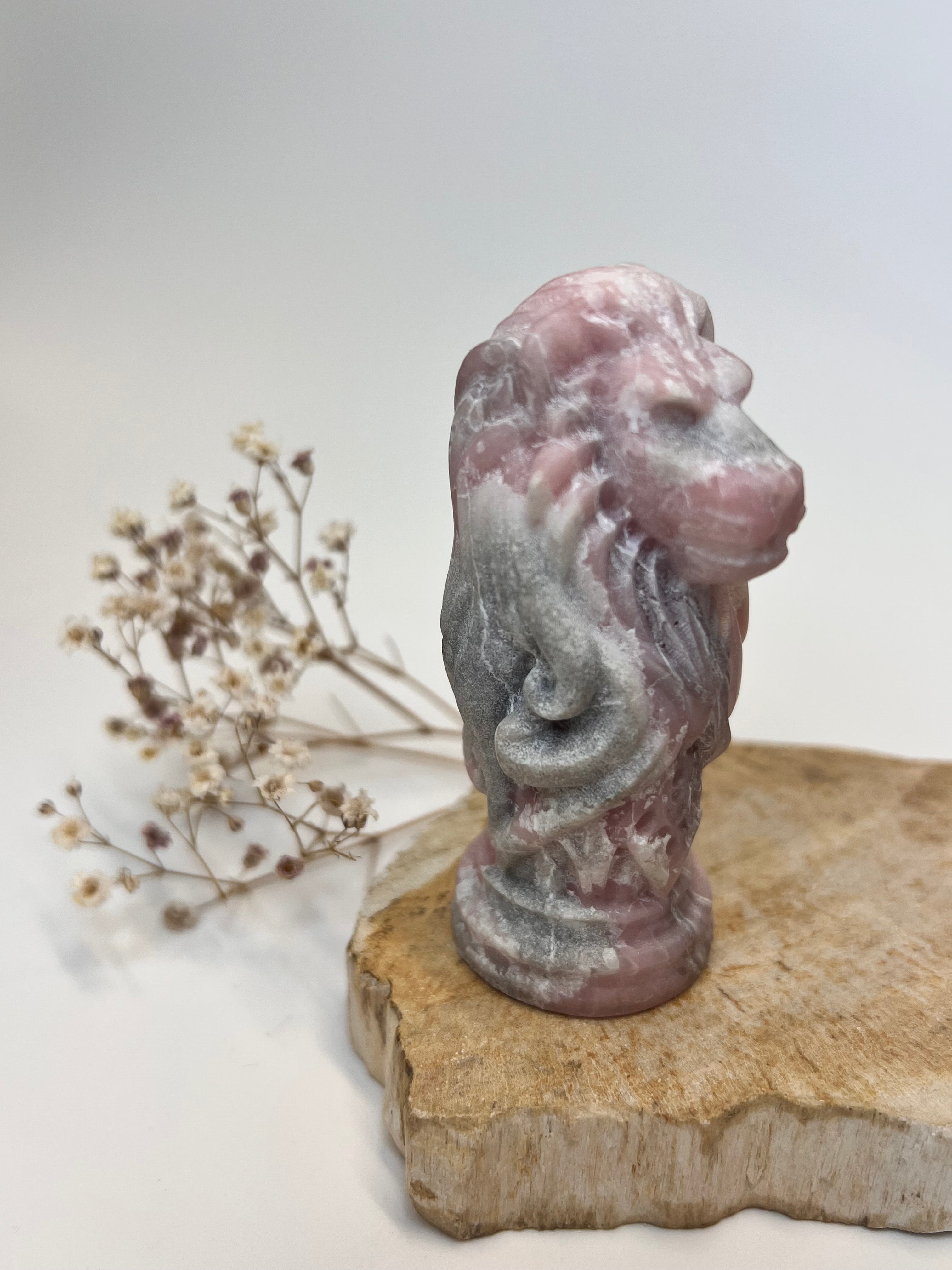 Pink Opal unterstützt emotionale Heilung, stärkt die Verbindung zu deinem inneren Kind und bringt Trost in verletzte Herzräume. In Löwengestalt wirkt er wie ein Hüter deines Herzens: wachsam, liebevoll, aufrecht.