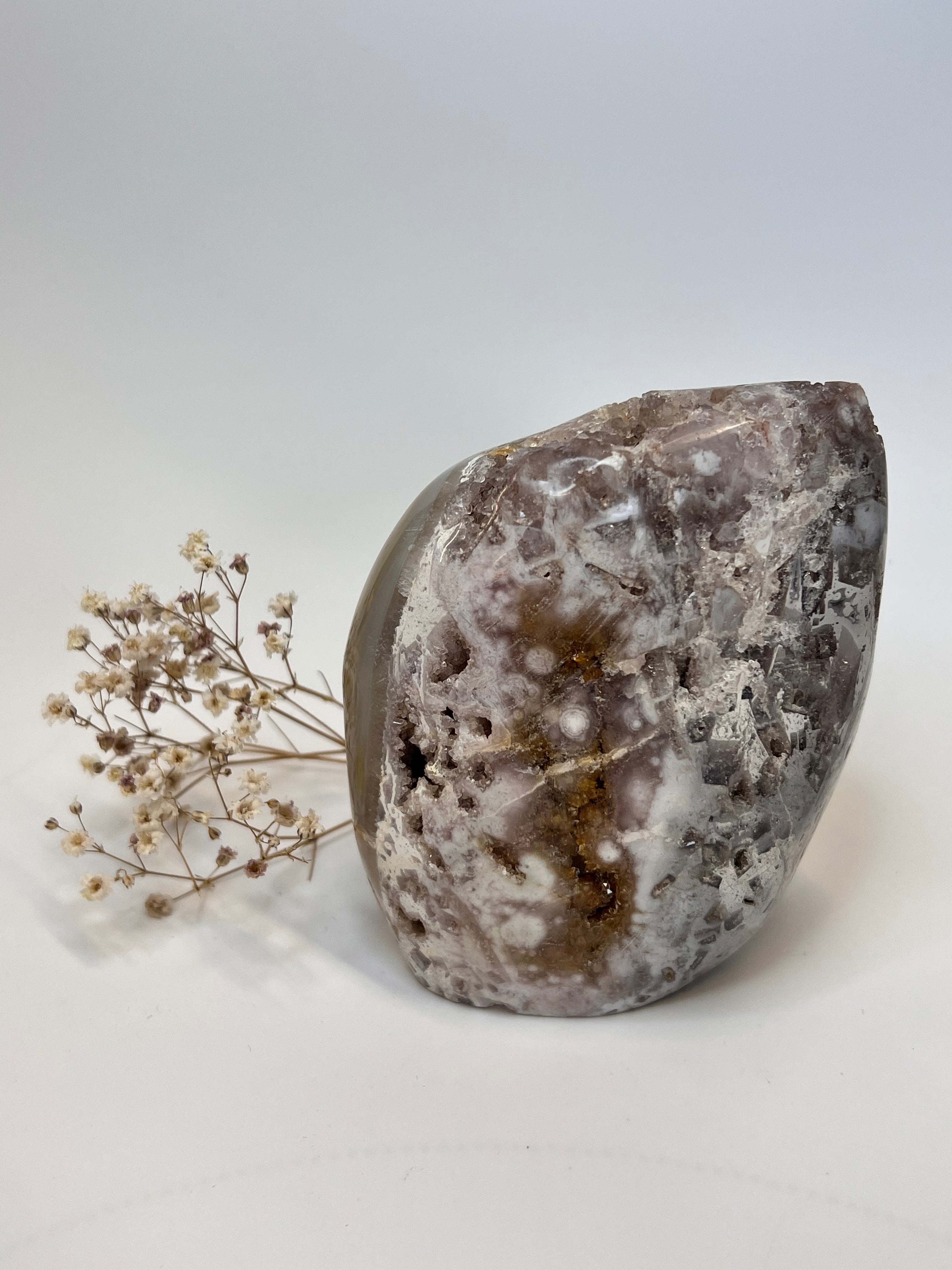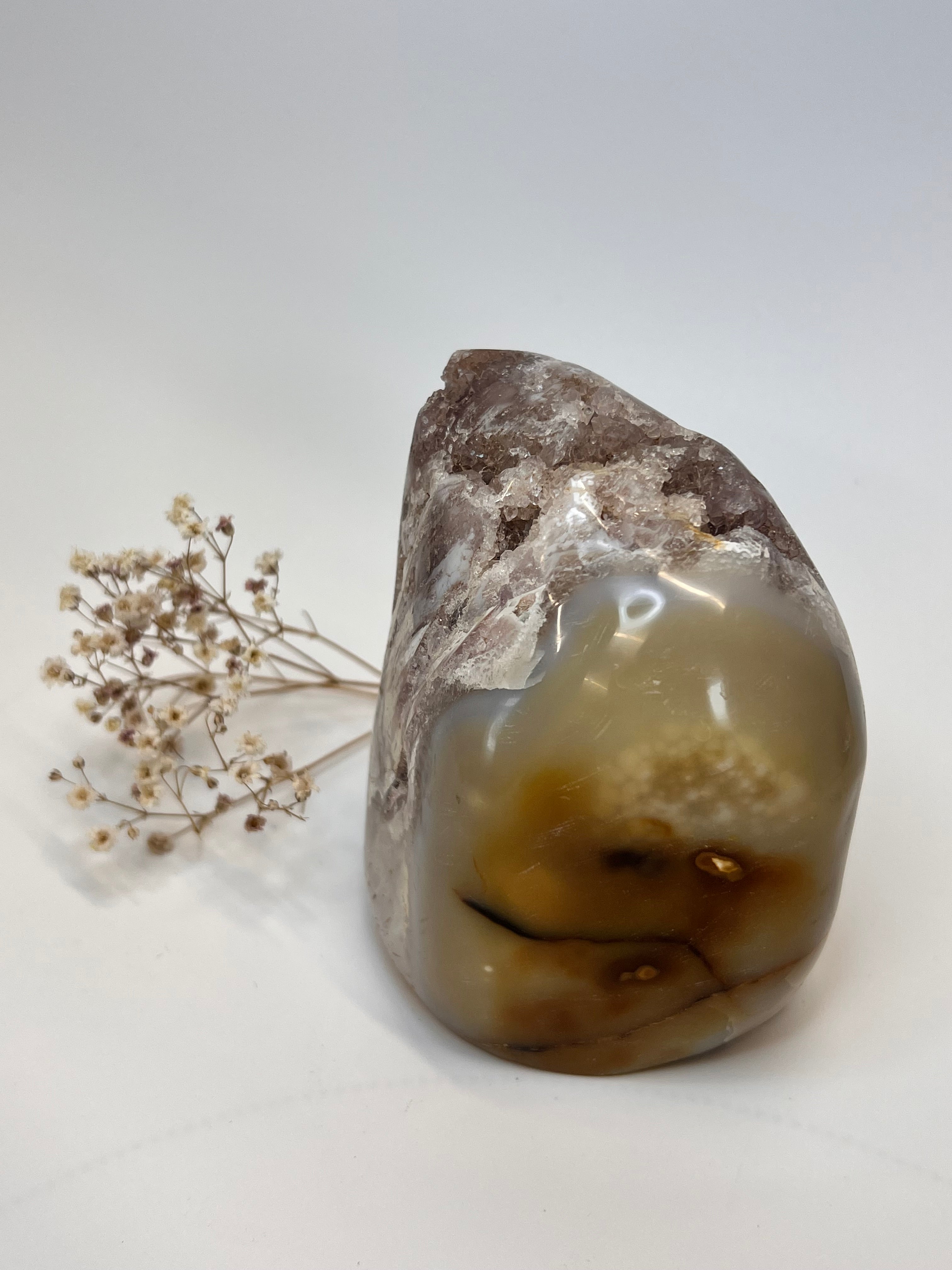 Diese einzigartige Freeform vereint die sanfte, tröstende Energie des Pink Amethysts mit der erdenden Klarheit des Achats. Zartes Rosa trifft auf strukturgebende Linien – wie Herz und Verstand, Gefühl und Stabilität, Licht und Wurzel.