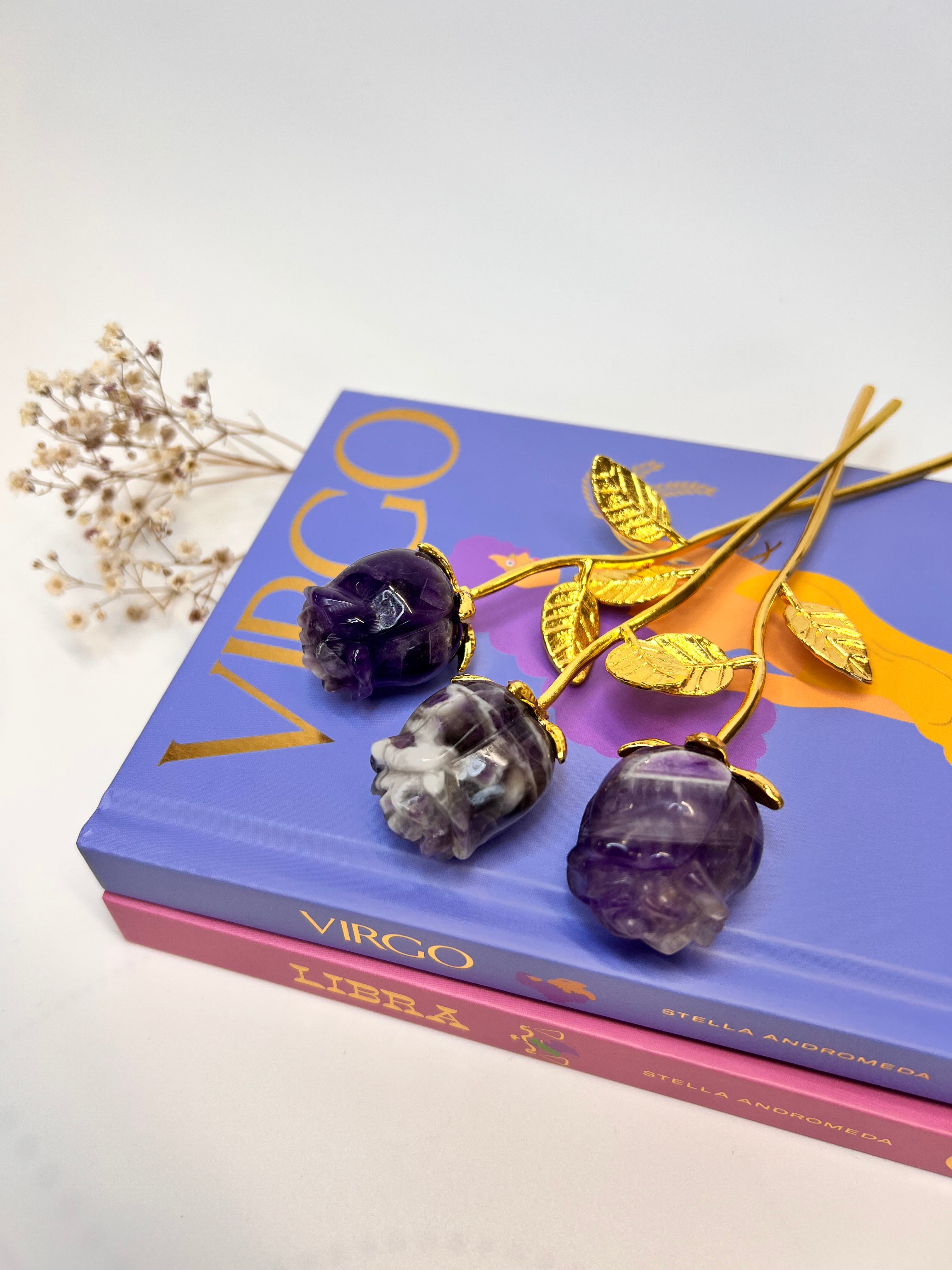 Amethyst gilt als Stein der Intuition, des Schutzes und der spirituellen Anbindung. Durch das roségoldene Finish entfaltet er eine ganz neue Aura – weich, warm und zugleich lichtvoll erhoben. Ein besonderer Begleiter für Meditation, deinen Altar oder als Geschenk für Menschen, die ihre innere Welt mit Stil ehren.