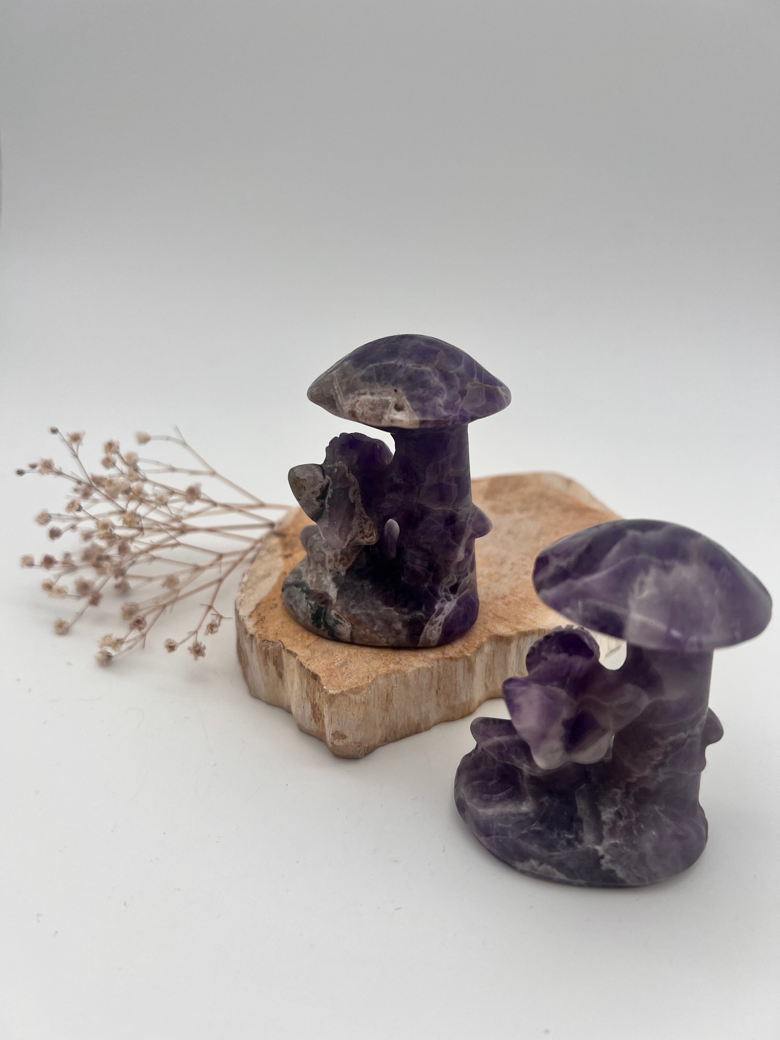 Diese kleine Amethyst-Fee hat sich unter einem schützenden Pilzdach niedergelassen – ein Symbol für Rückzug, Träume und himmlische Führung. Gefertigt aus echtem Amethyst, bringt sie Ruhe, Klarheit und ein Gefühl von Geborgenheit in dein Zuhause.