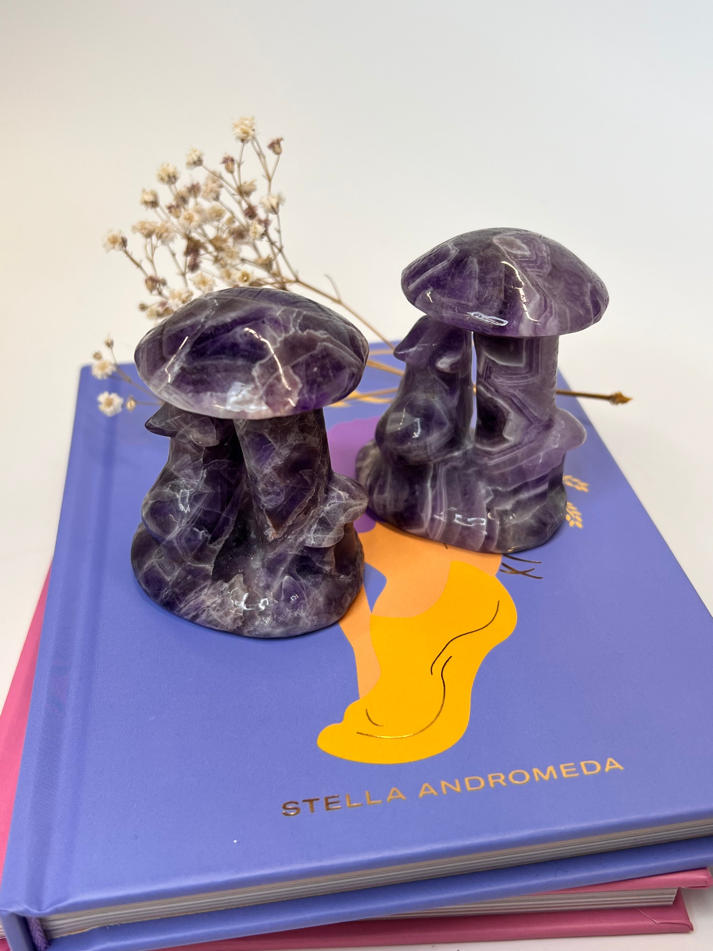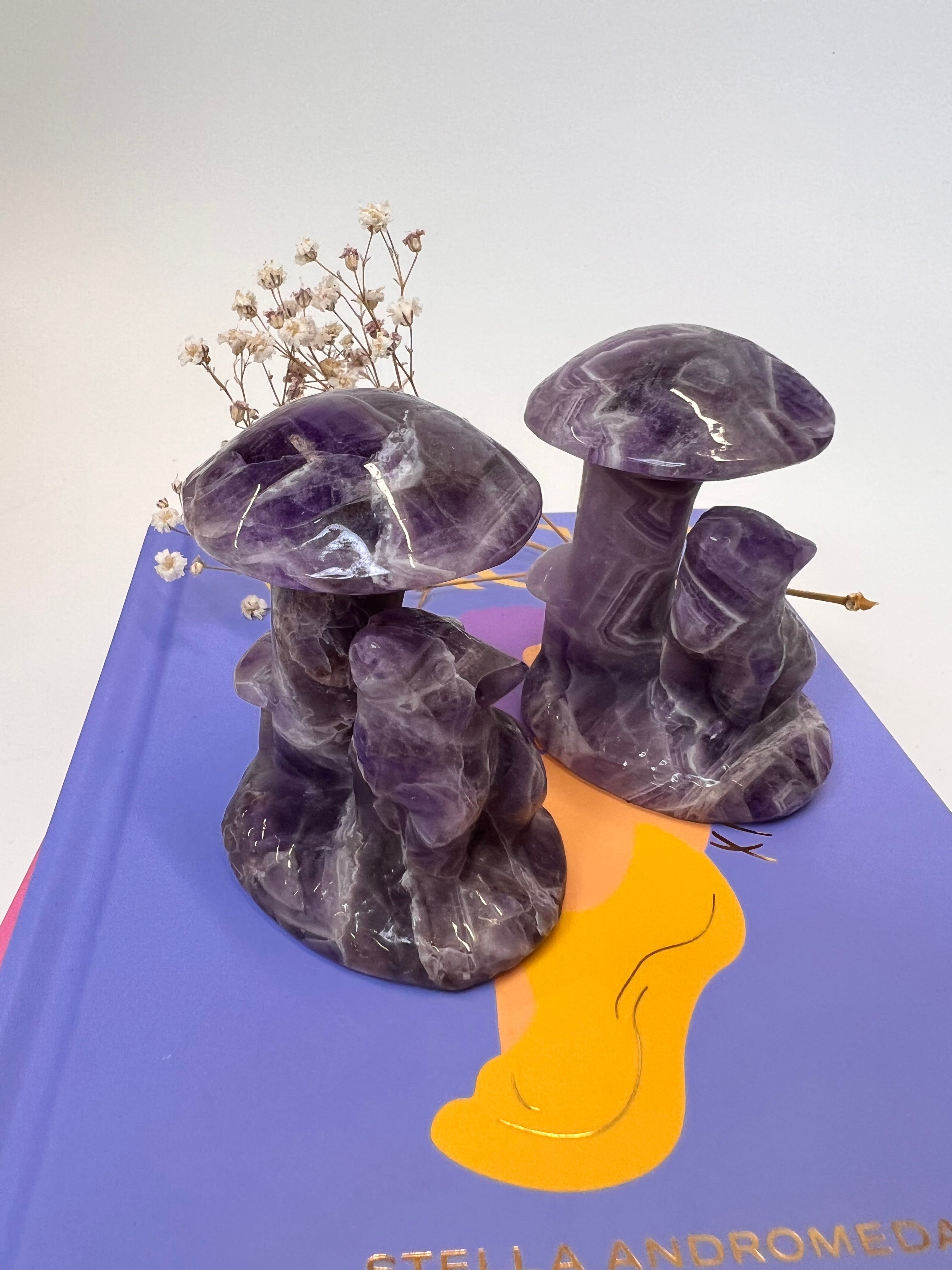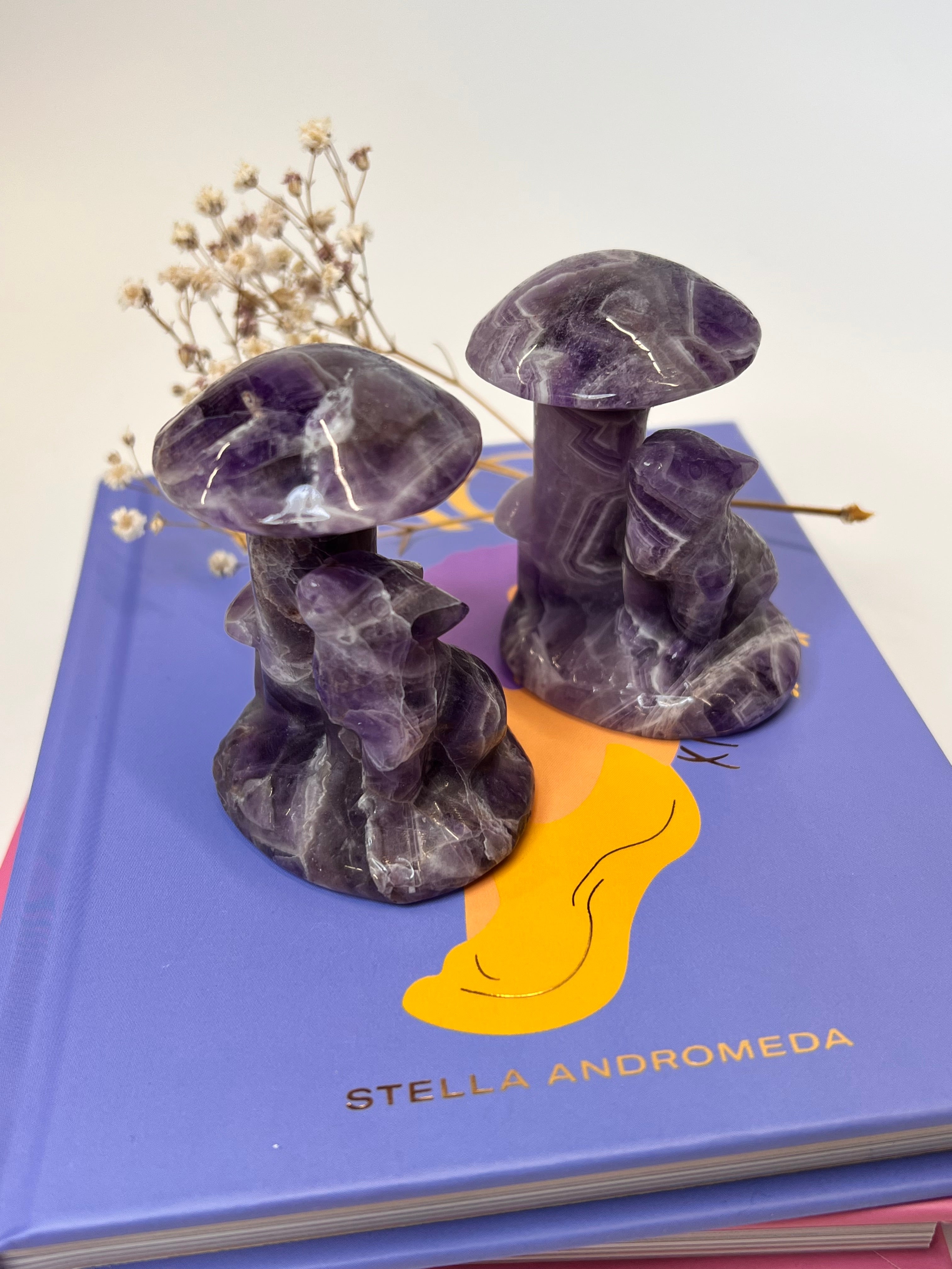 Dieses detailverliebte Carving zeigt einen Wolf, der unter einem Pilz ruht – ein Symbol für Rückzug, Stille und die tiefe Verbindung zur Natur. Gefertigt aus schimmerndem Amethyst bringt dieses Stück eine magische Waldenergie mit sich: Der Wolf wacht still über deine Seele, der Pilz schenkt Geborgenheit und Schutz.