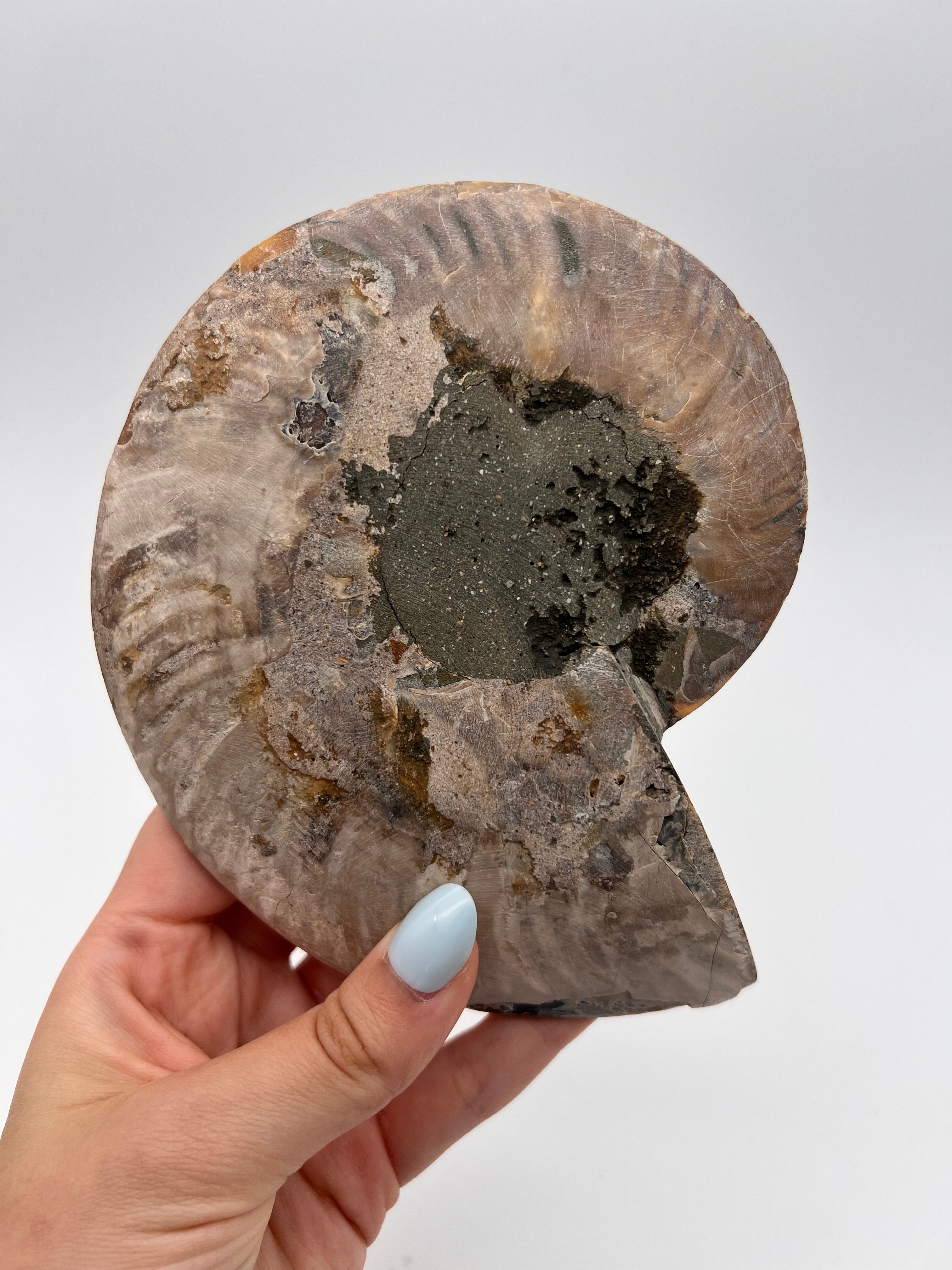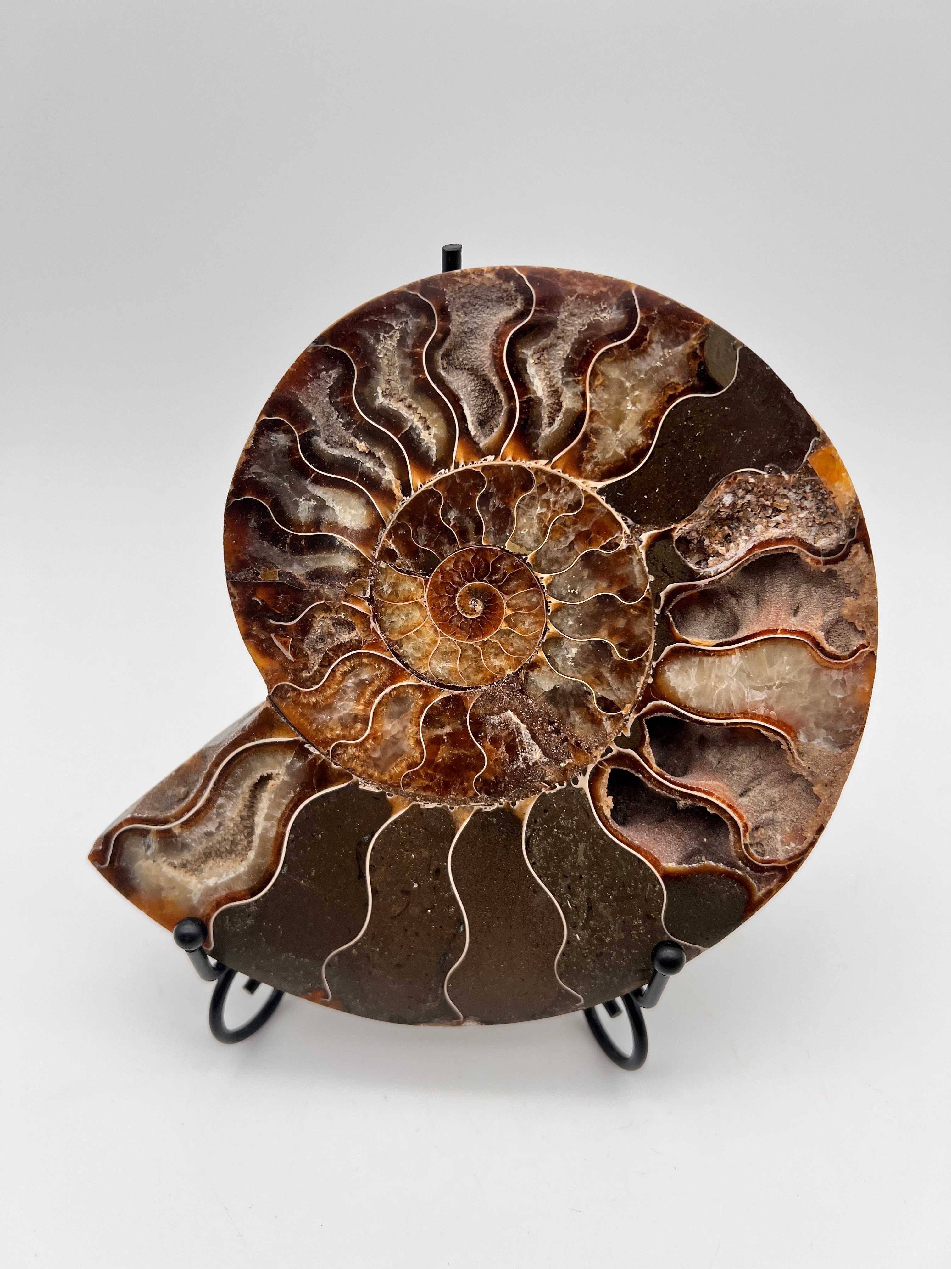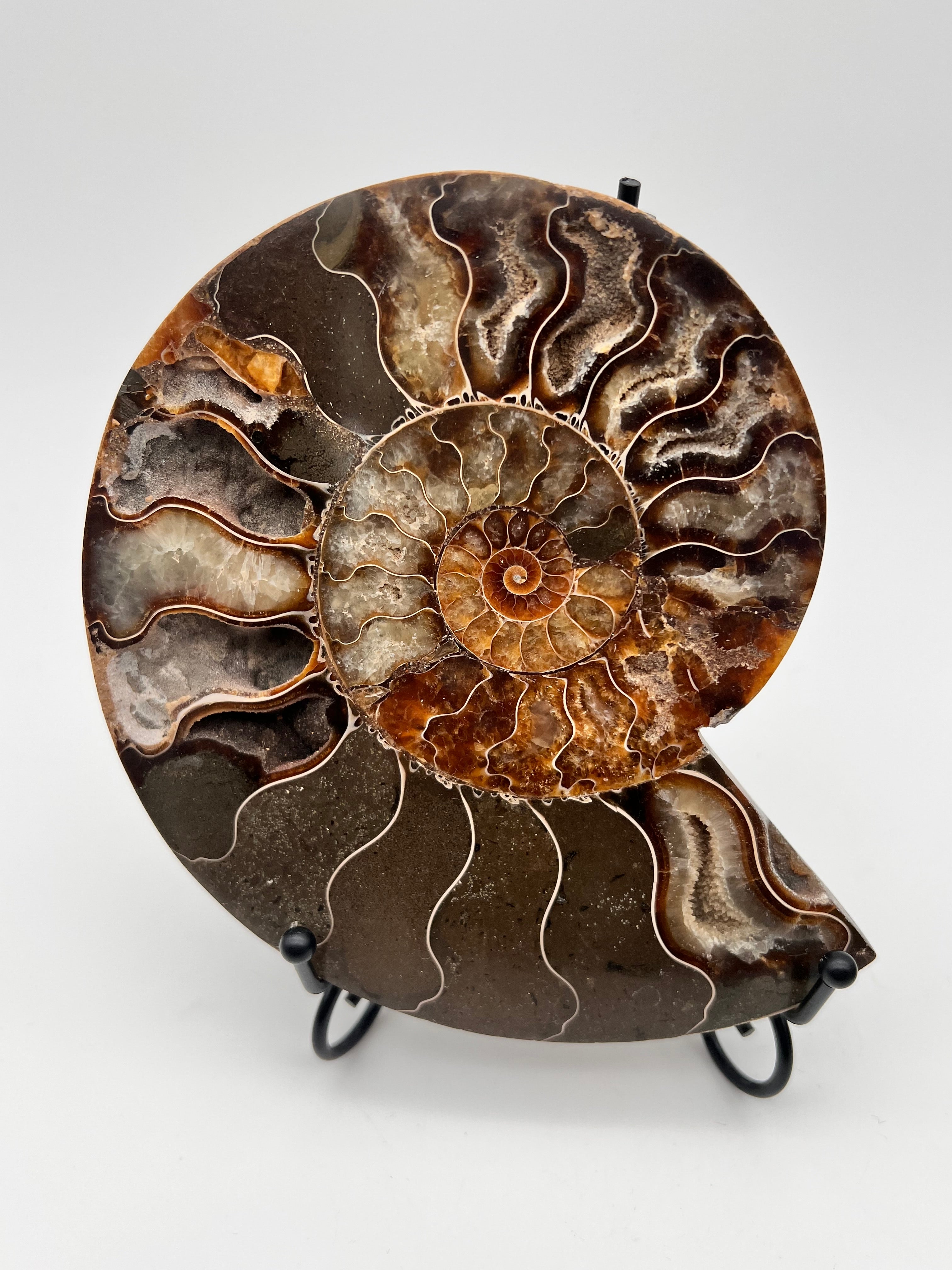 Dieser versteinerte Ammonit mit natürlicher Druzy-Bildung verbindet die uralte Energie vergangener Zeitalter mit dem glitzernden Zauber der Kristallwelt. Die Spirale des Ammoniten erinnert an die Reise des Lebens – und die kleinen funkelnden Kristalle an die Magie, die uns dabei begleitet.