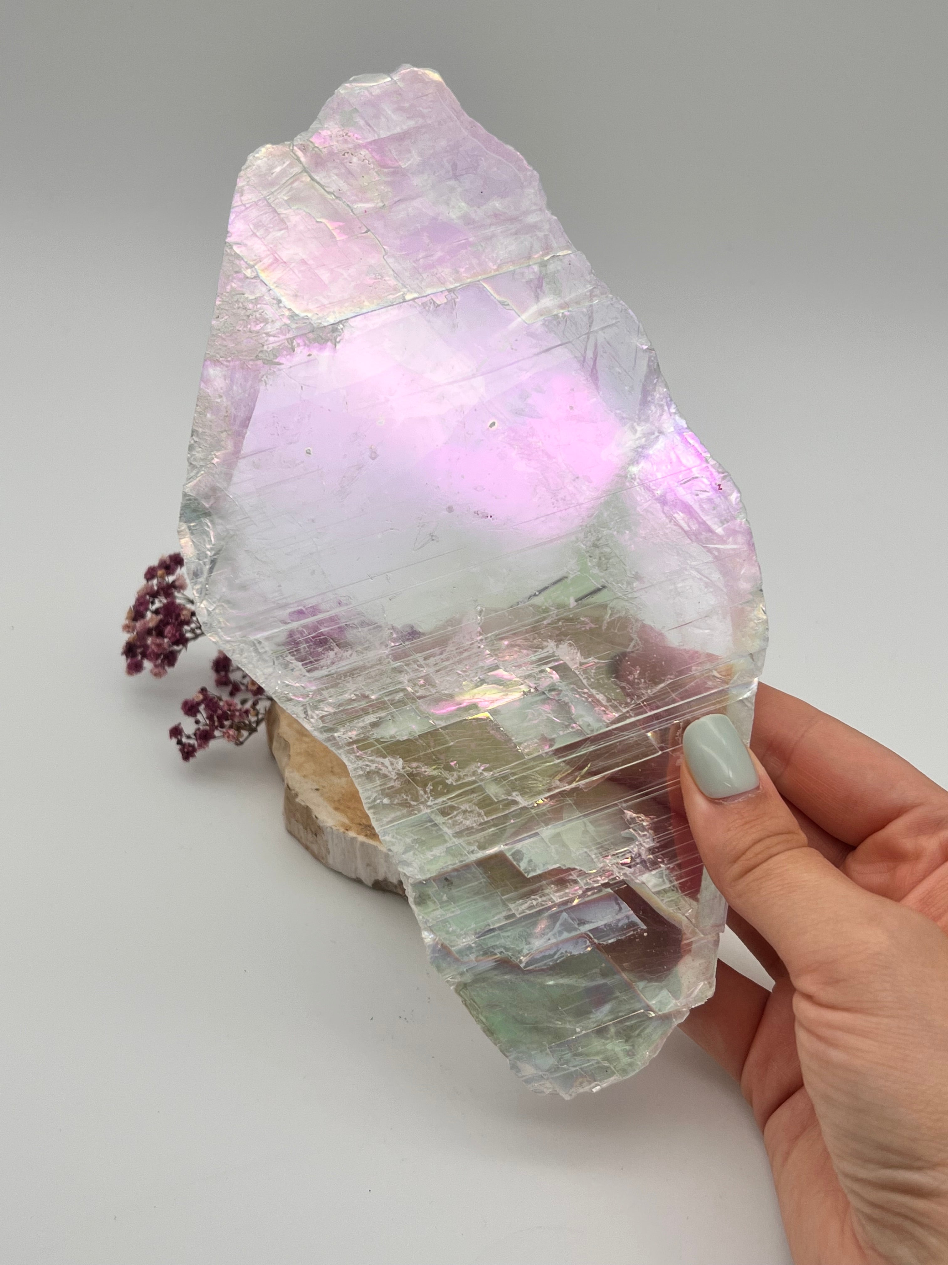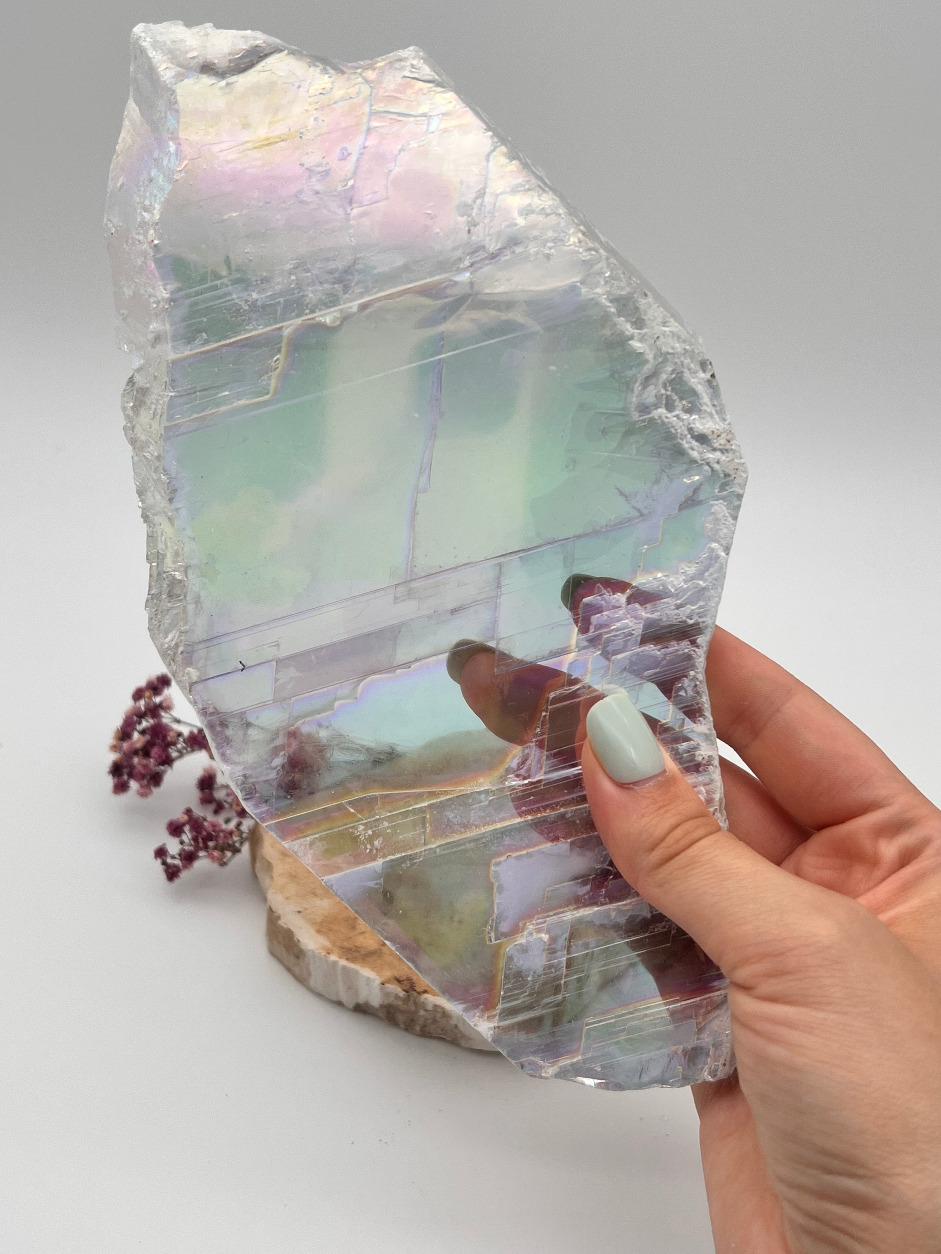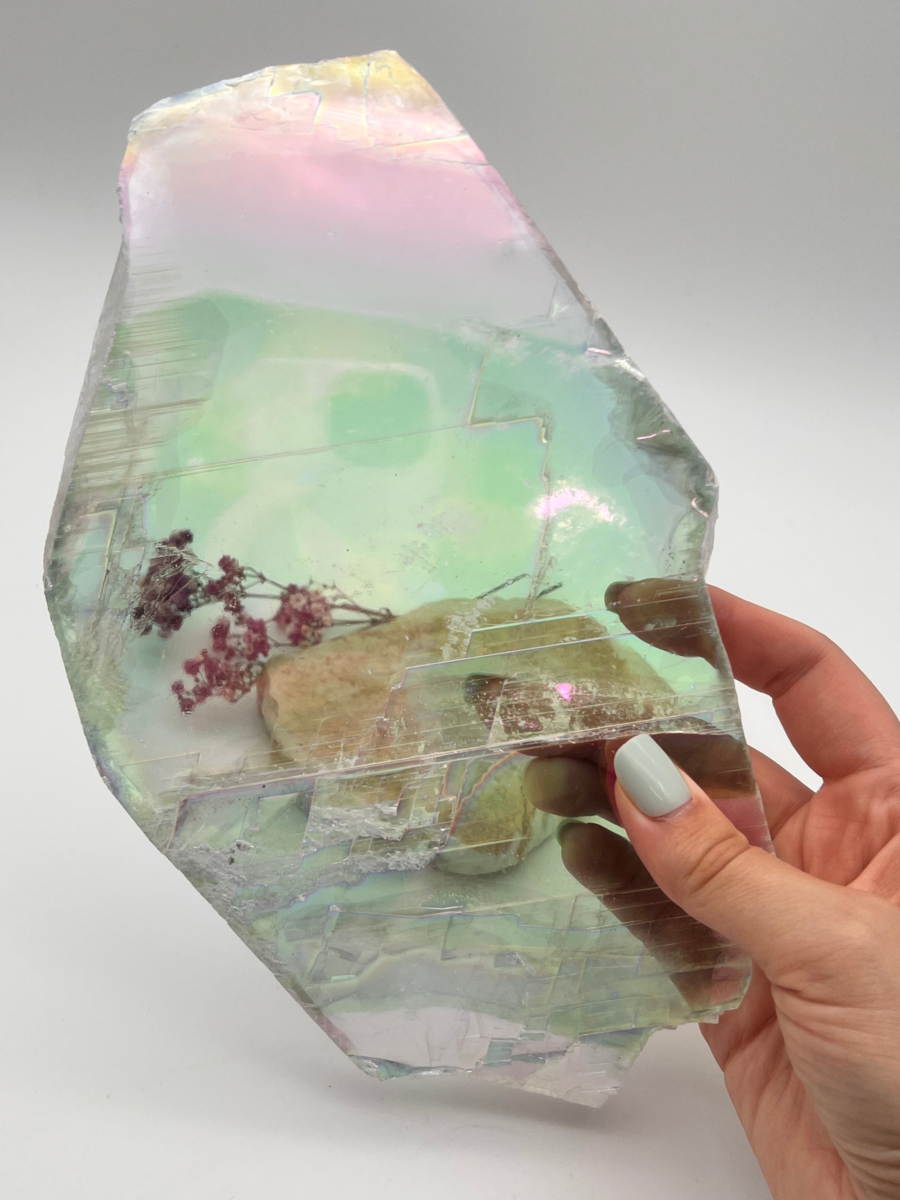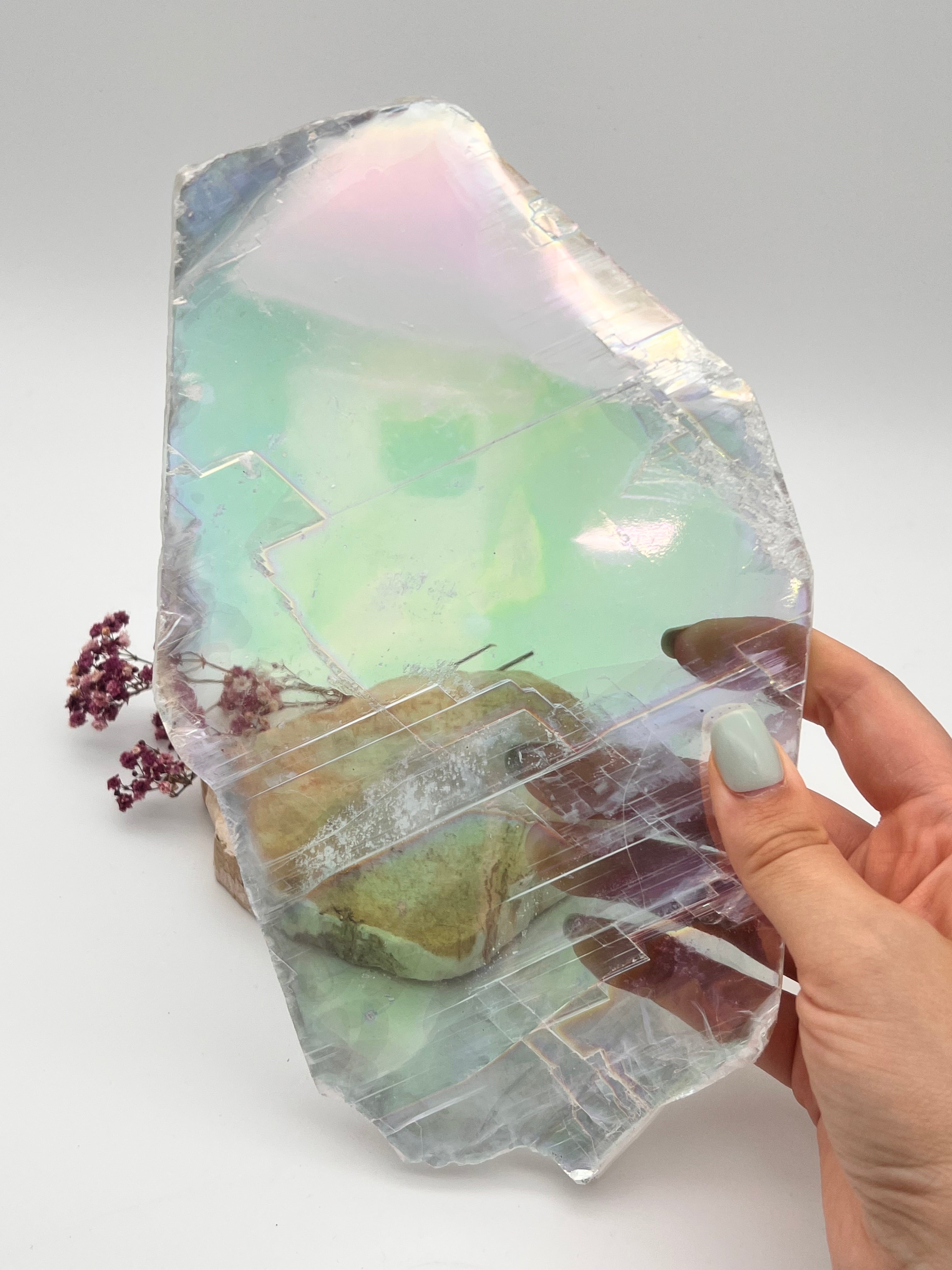 ✨ Dieses schimmernde Slab aus Aura-Selenit (Marienglas) wirkt wie ein Tor zwischen den Welten. Die Kombination aus durchscheinender Struktur und zartem Regenbogenschimmer schafft eine hochschwingende Atmosphäre und unterstützt dich dabei, dich mit deiner inneren Weisheit und höheren Ebenen zu verbinden. Perfekt für Lichtarbeit, Aurareinigung und zum Aufladen anderer Kristalle.