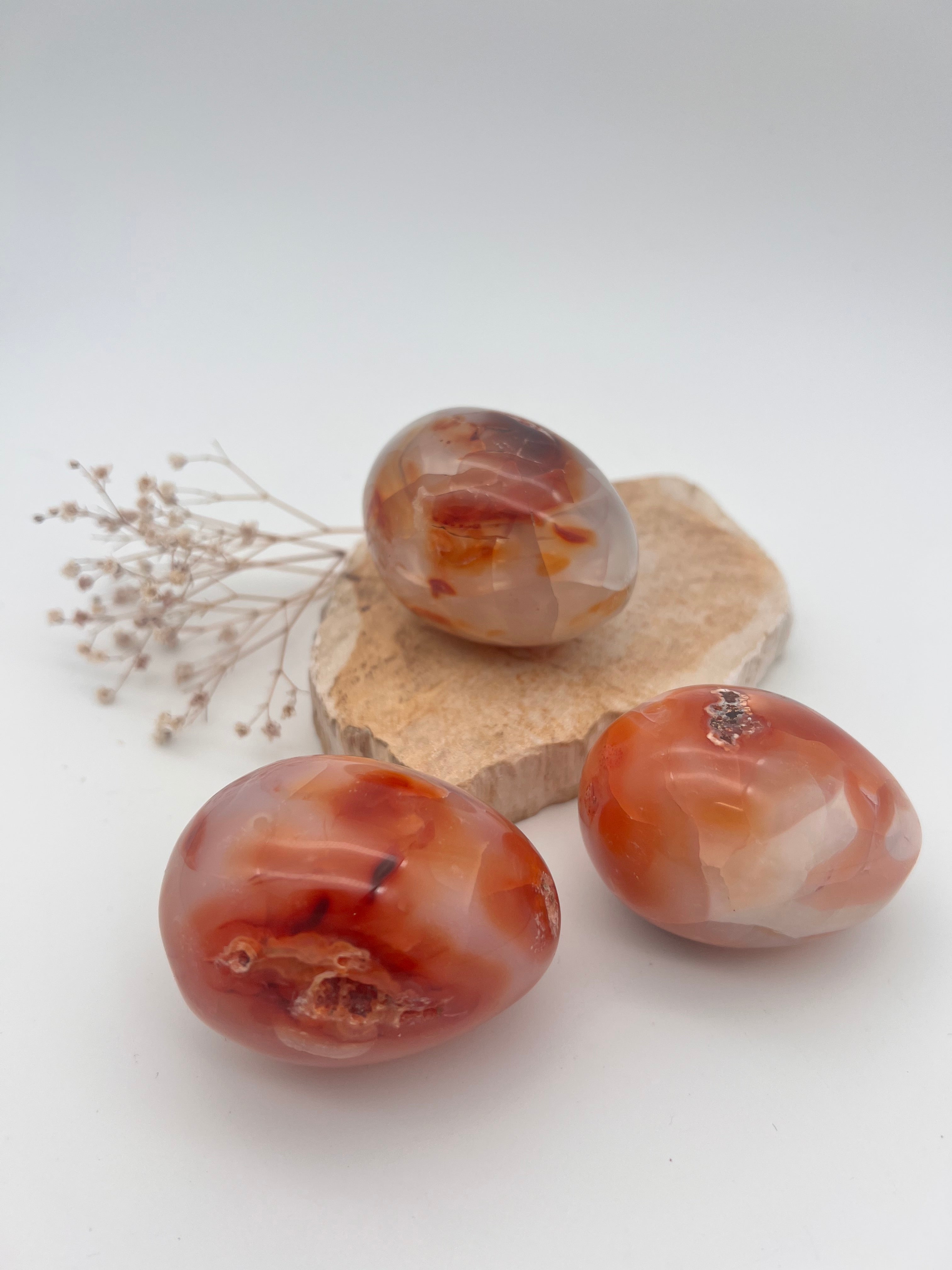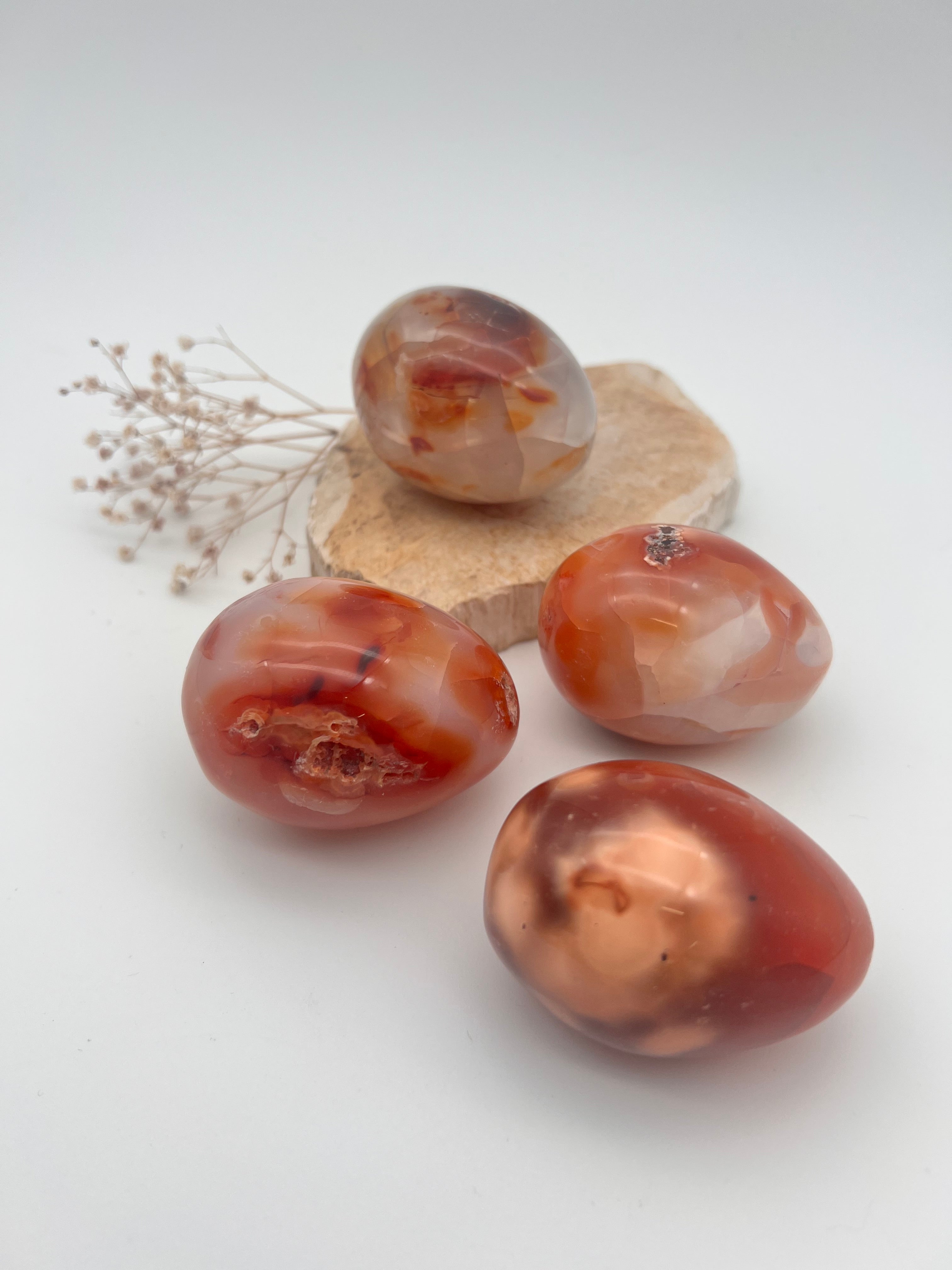 Karneol steht für Lebensfreude, Tatkraft und Kreativität. Er kann helfen, Ängste abzubauen, das Selbstvertrauen zu stärken und neue Projekte mit Begeisterung anzugehen. Besonders in Eiform eignet er sich zur Meditation oder als kraftvolles Deko-Objekt auf deinem Altar.