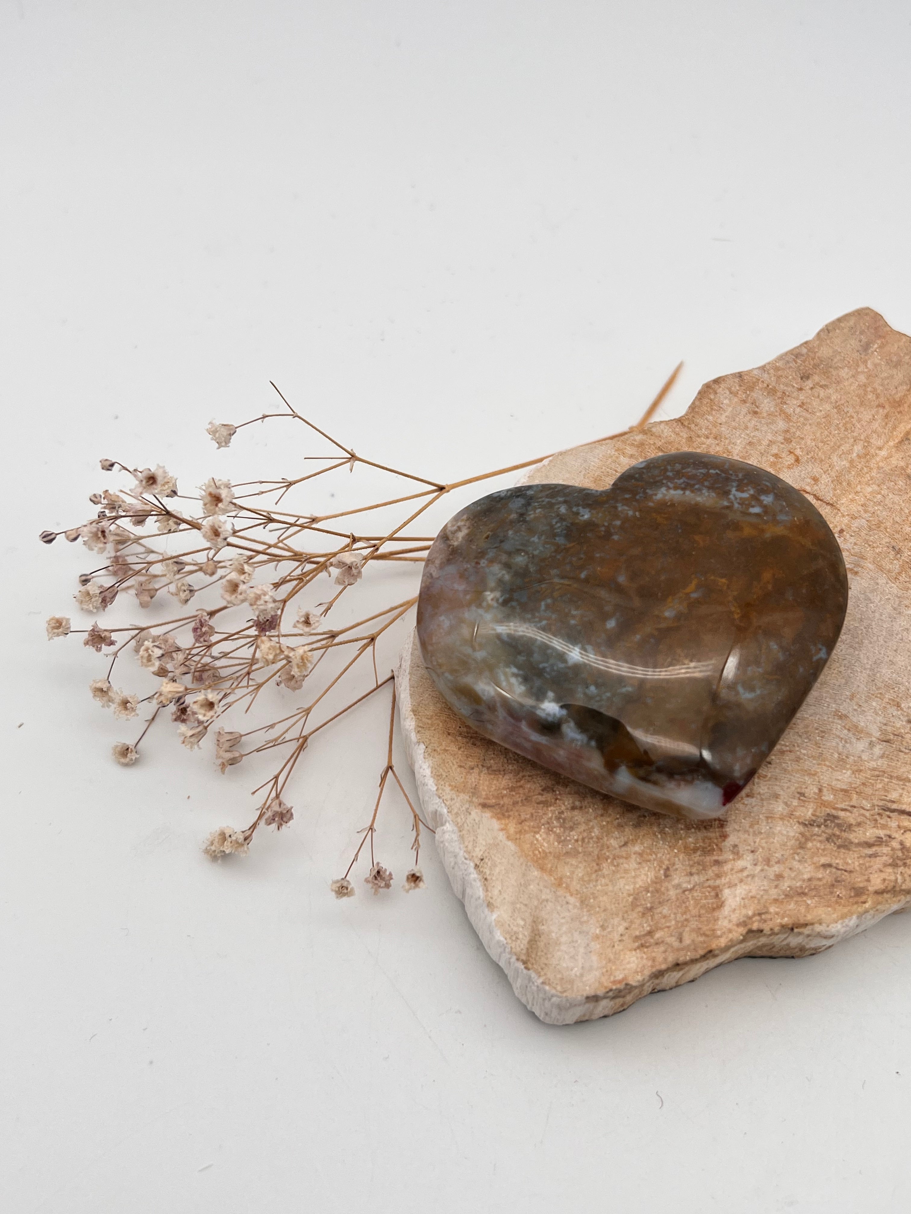 Dieses liebevoll geformte Ocean Jasper Herz strahlt die beruhigende Kraft des Meeres und die heilsame Energie bedingungsloser Liebe aus.