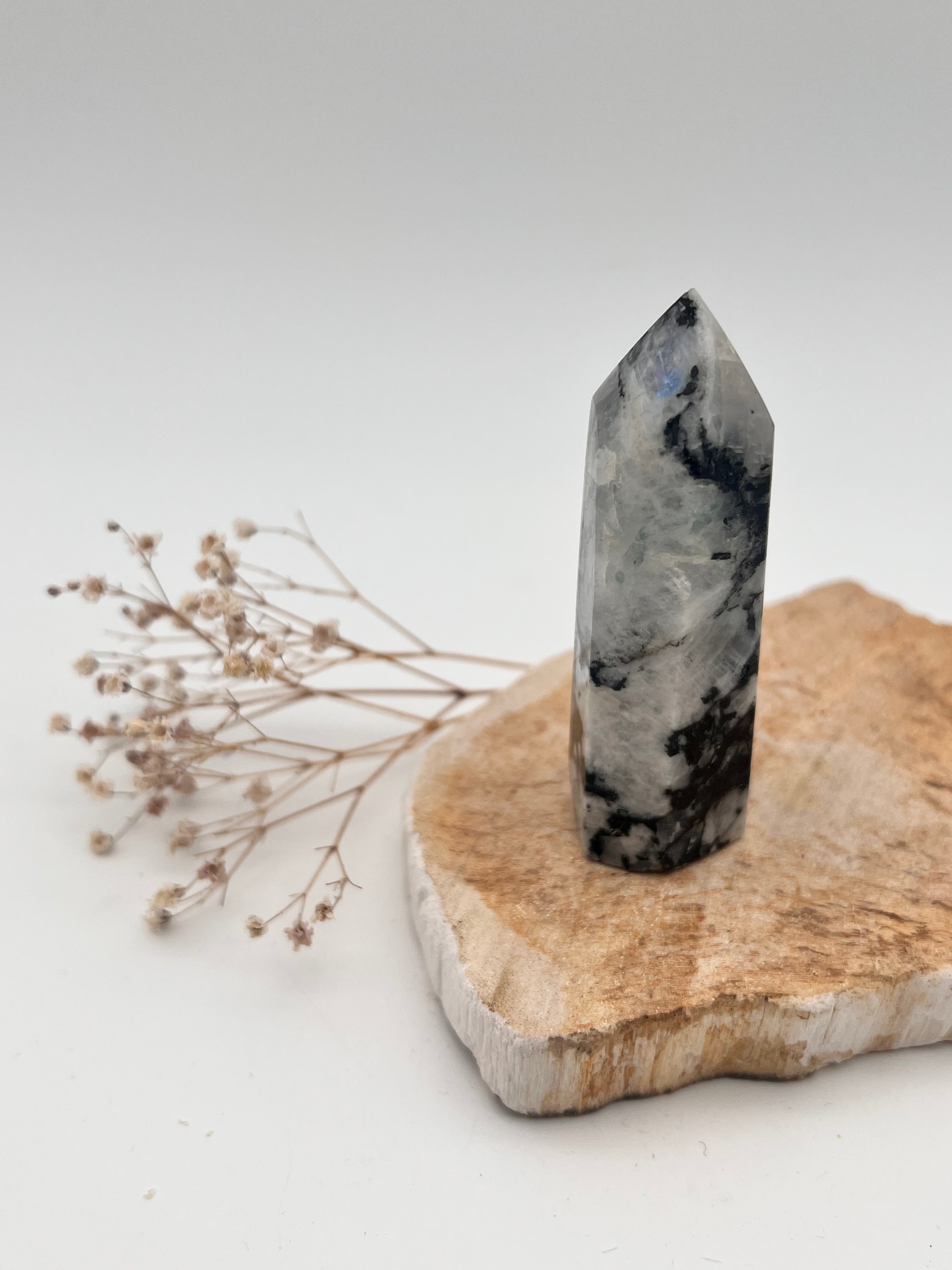 Dieser zauberhafte Regenbogen-Mondstein trägt die sanfte Schwingung des Mondes und erinnert dich daran, dass dein inneres Licht auch in dunklen Zeiten leuchtet.