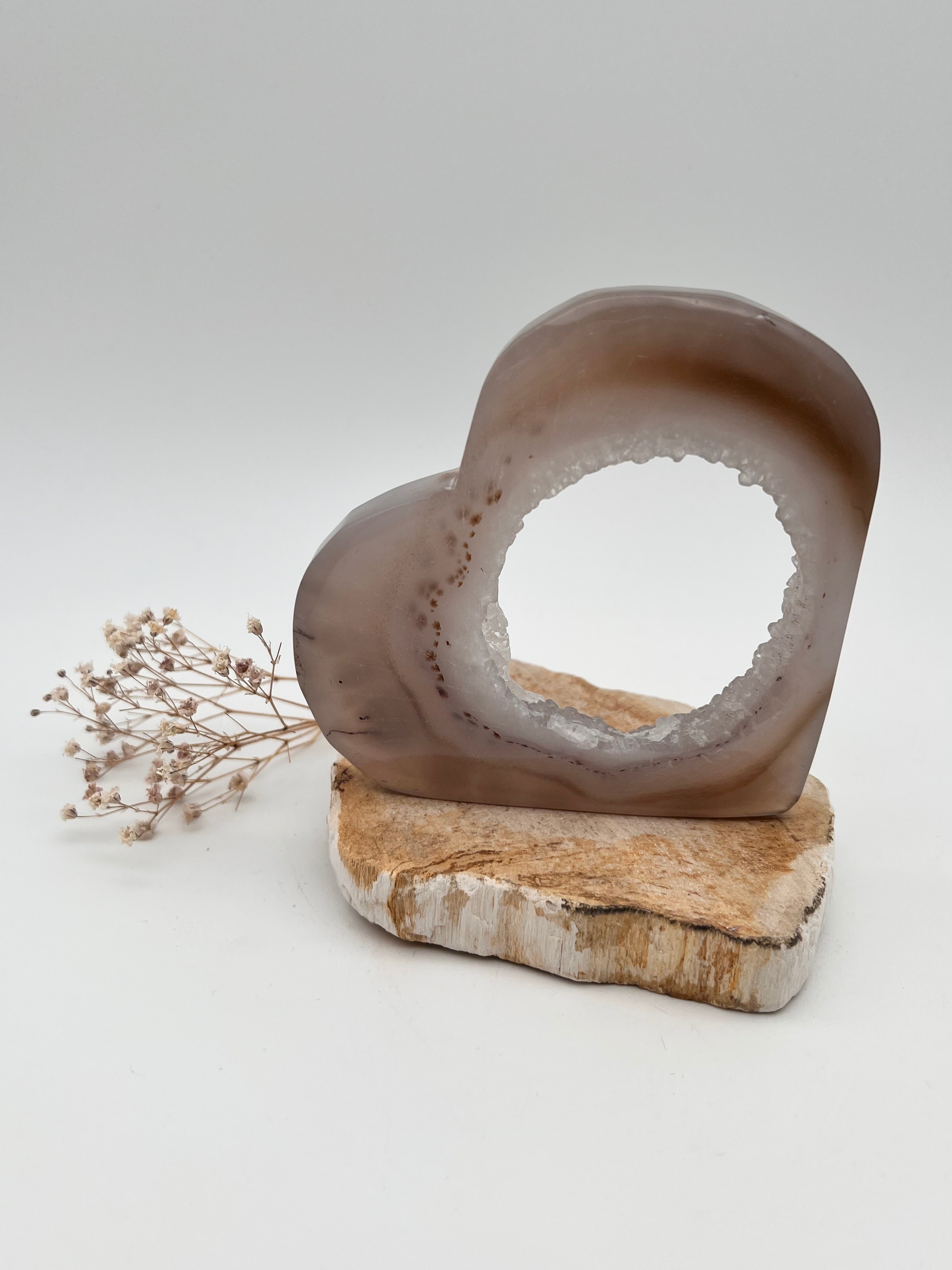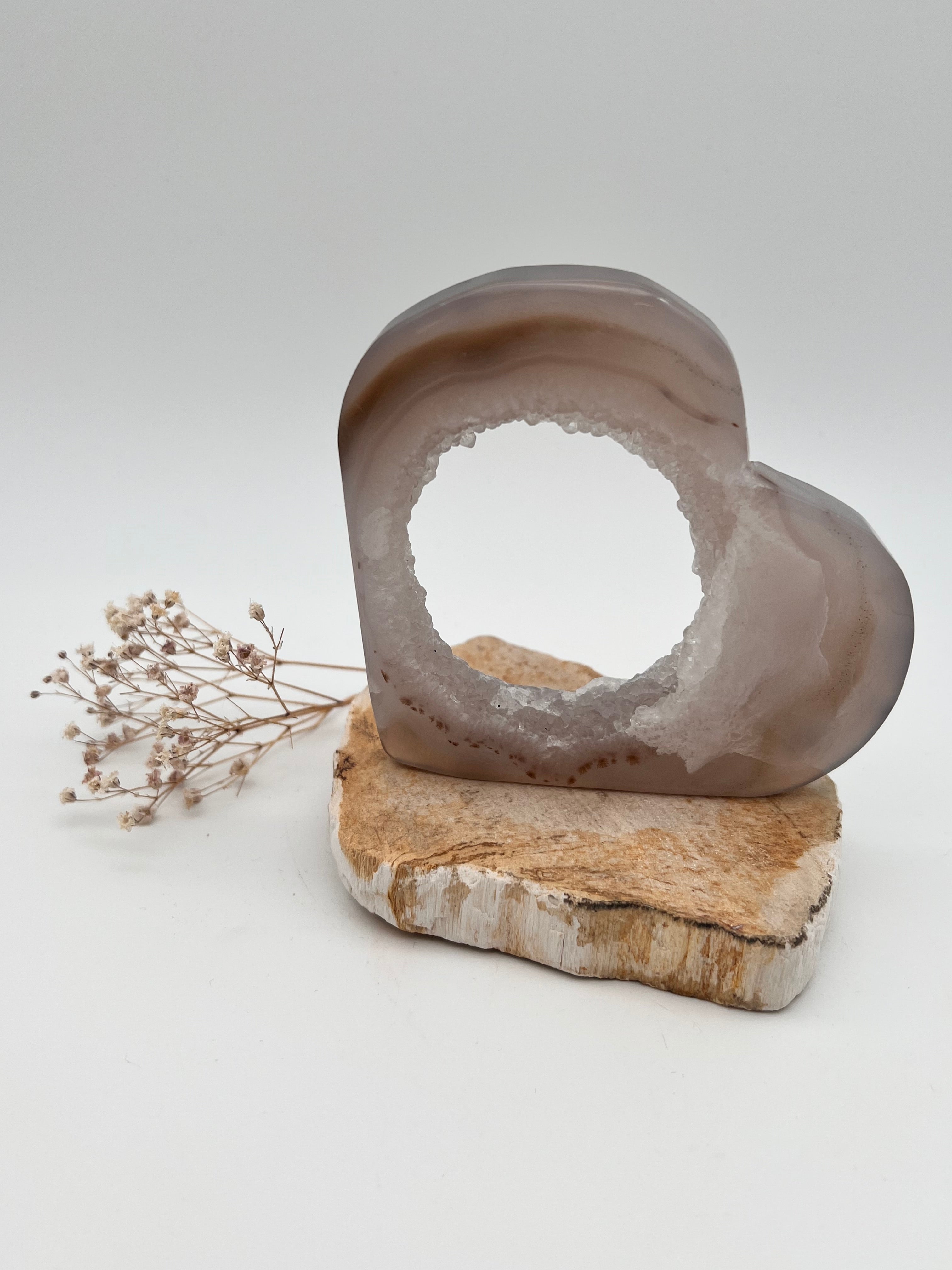 Dieses wunderschöne Achat-Herz mit offener Druse vereint auf harmonische Weise Natur und Symbolik. Die sanften Brauntöne und die funkelnde Kristallstruktur im Inneren machen es zu einem einzigartigen Einzelstück – perfekt, um Liebe, Geborgenheit und innere Stärke in dein Leben zu bringen.