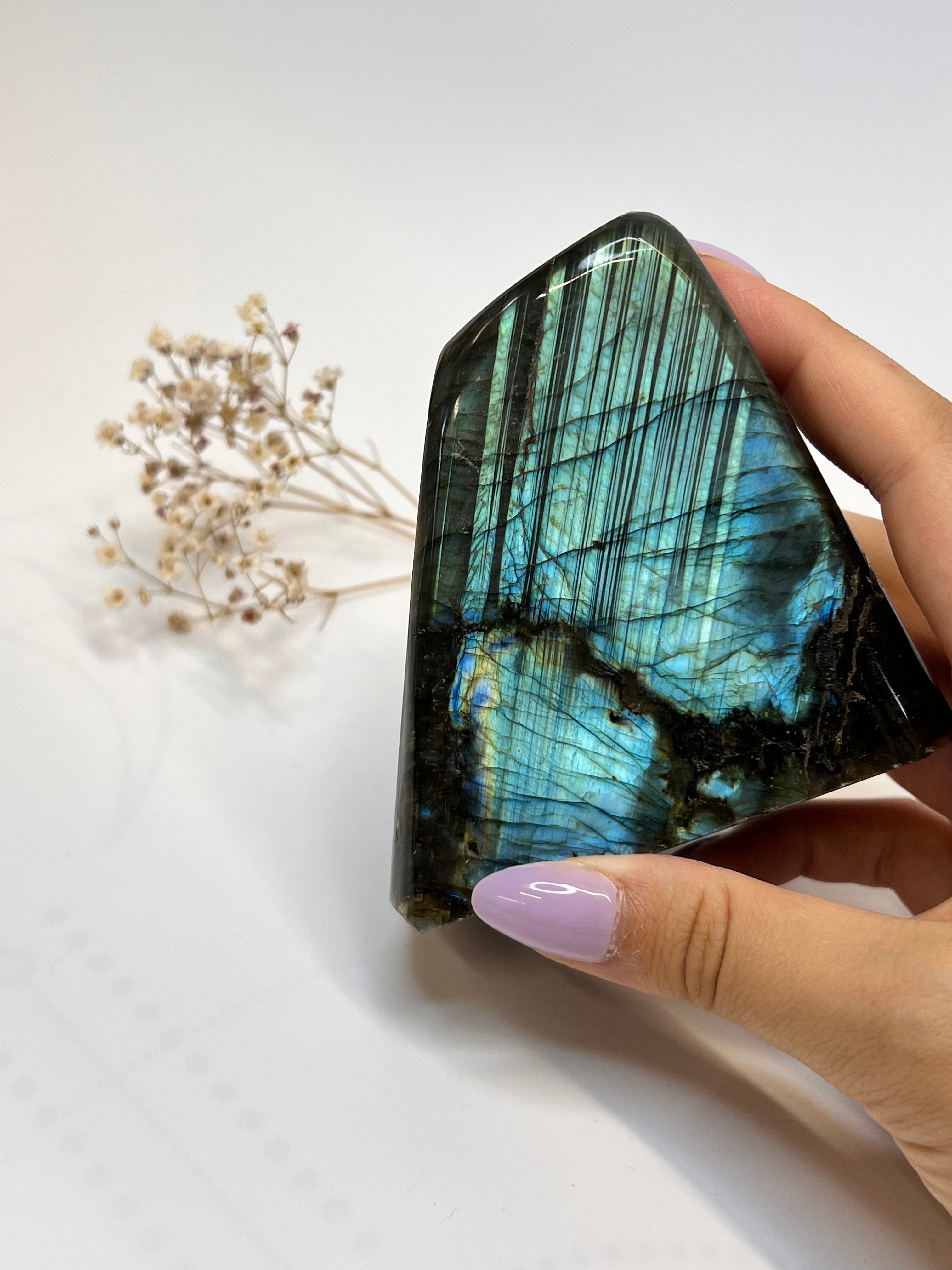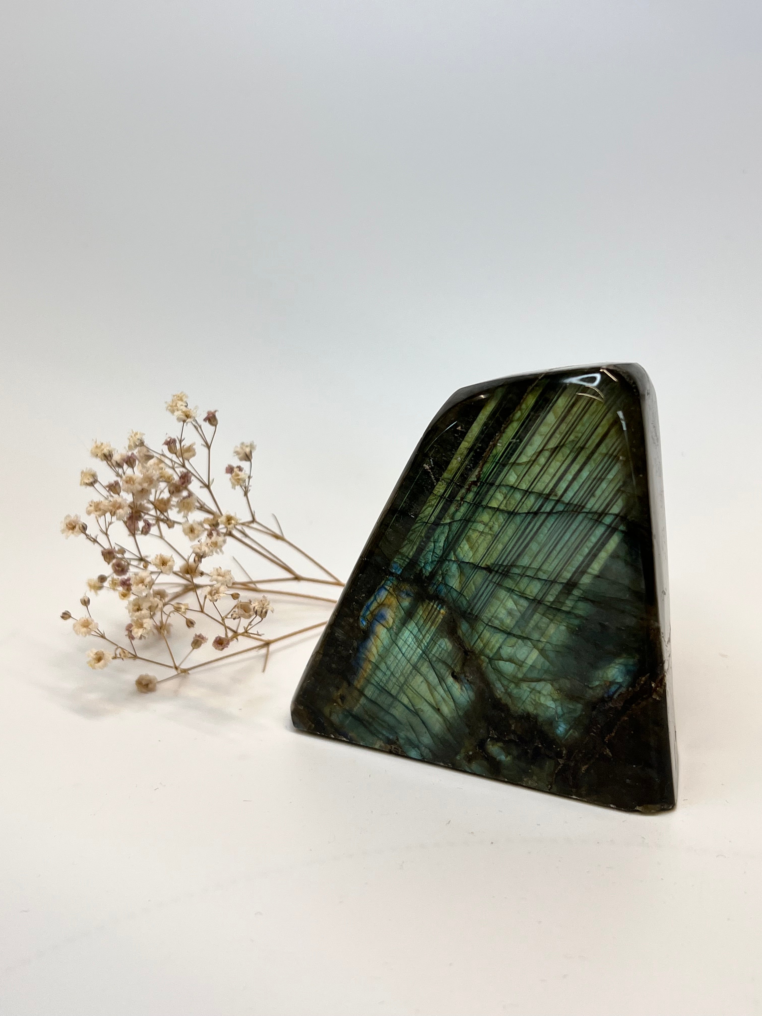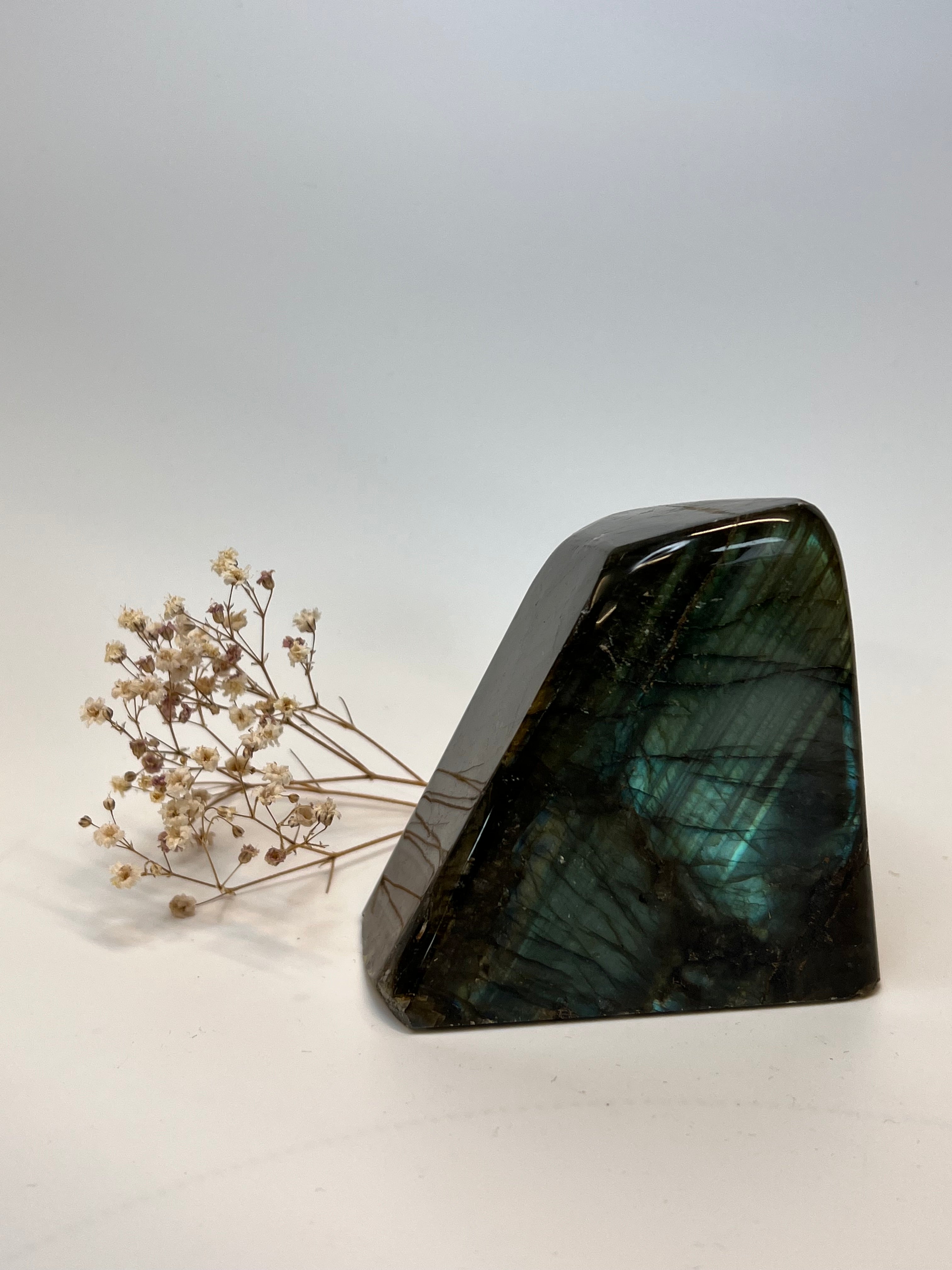 Labradorit gilt als Stein der Magie und Intuition. Er stärkt deine energetischen Grenzen, verbindet dich mit deinem inneren Wissen und wirkt wie ein Schutzschild gegen äußere Reize. Der intensive Schimmer in dieser Freeform öffnet nicht nur das dritte Auge, sondern auch das Herz für das, was jenseits der sichtbaren Welt liegt.