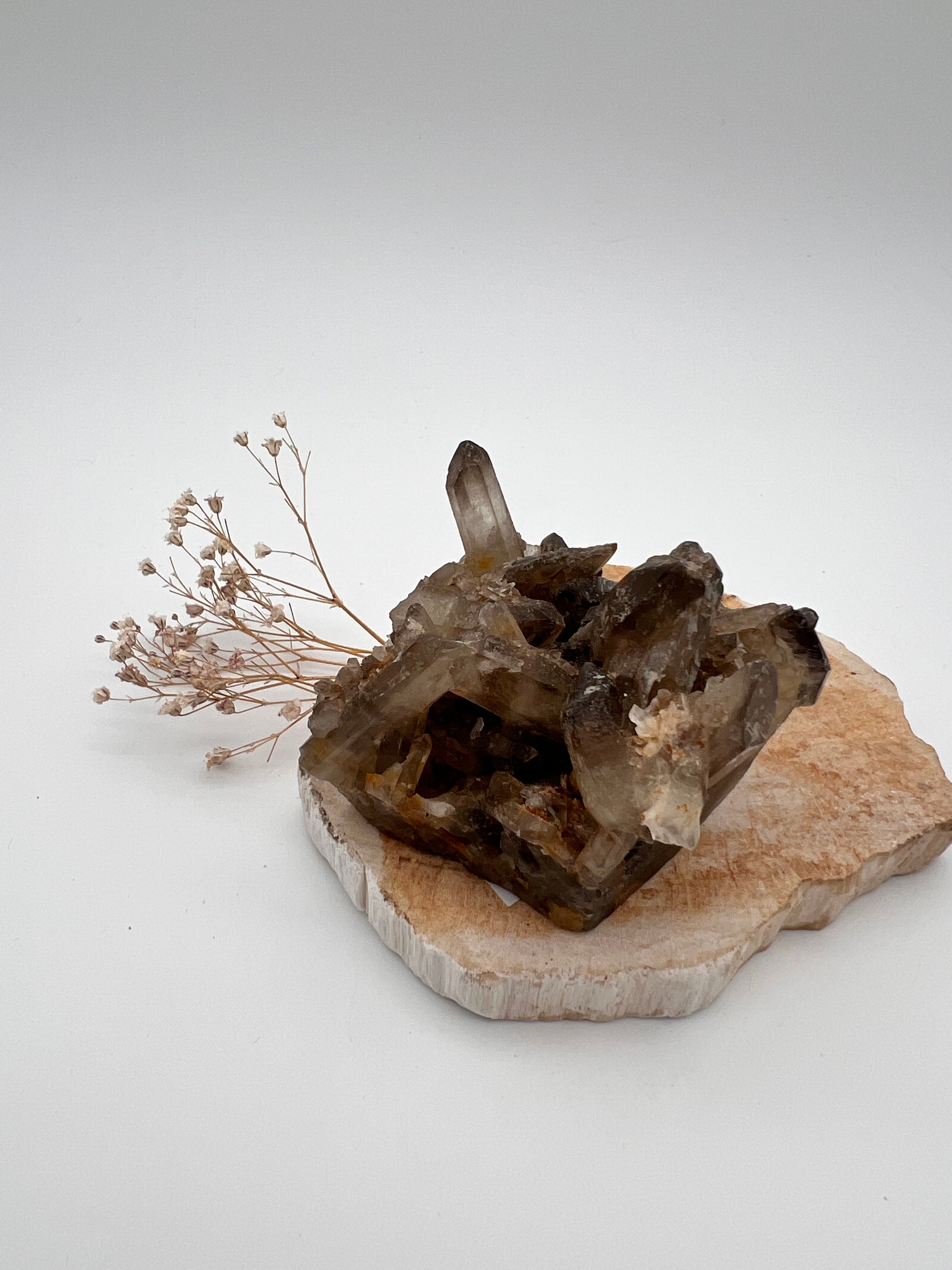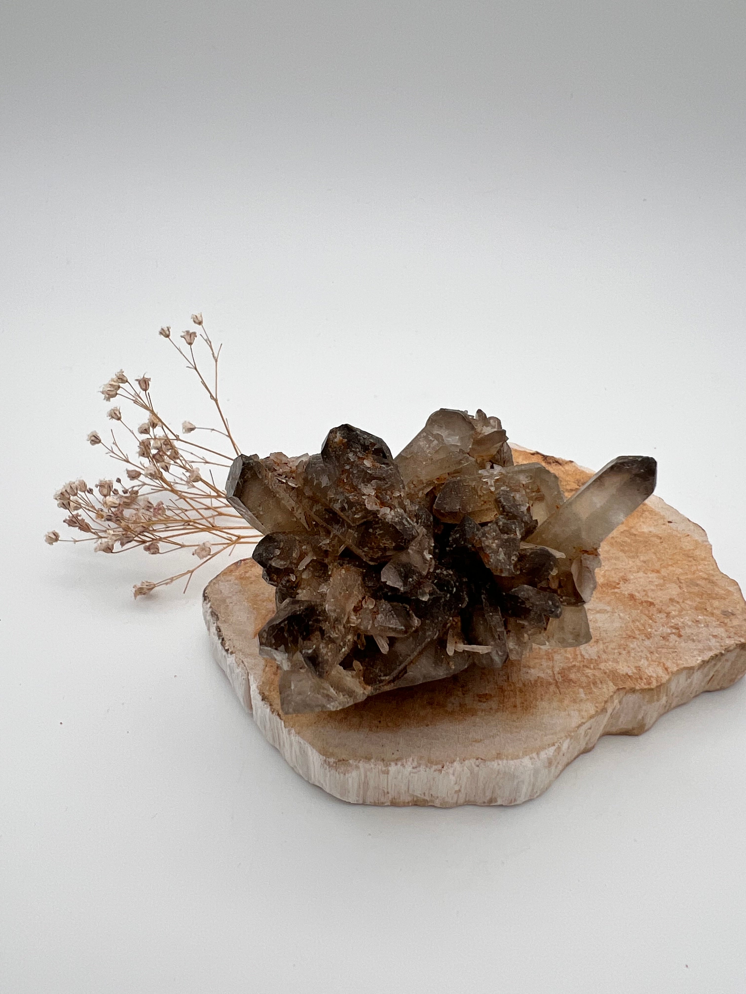 Dieser kraftvolle Rauchquarz-Cluster ist ein wahres Erdungswunder – mit seiner dunklen, mystischen Ausstrahlung schützt er dich vor negativen Energien und hilft dabei, alte Themen loszulassen. Er bringt Stabilität, Klarheit und Ruhe in chaotische Phasen und wirkt wie ein energetischer Anker im Alltag.