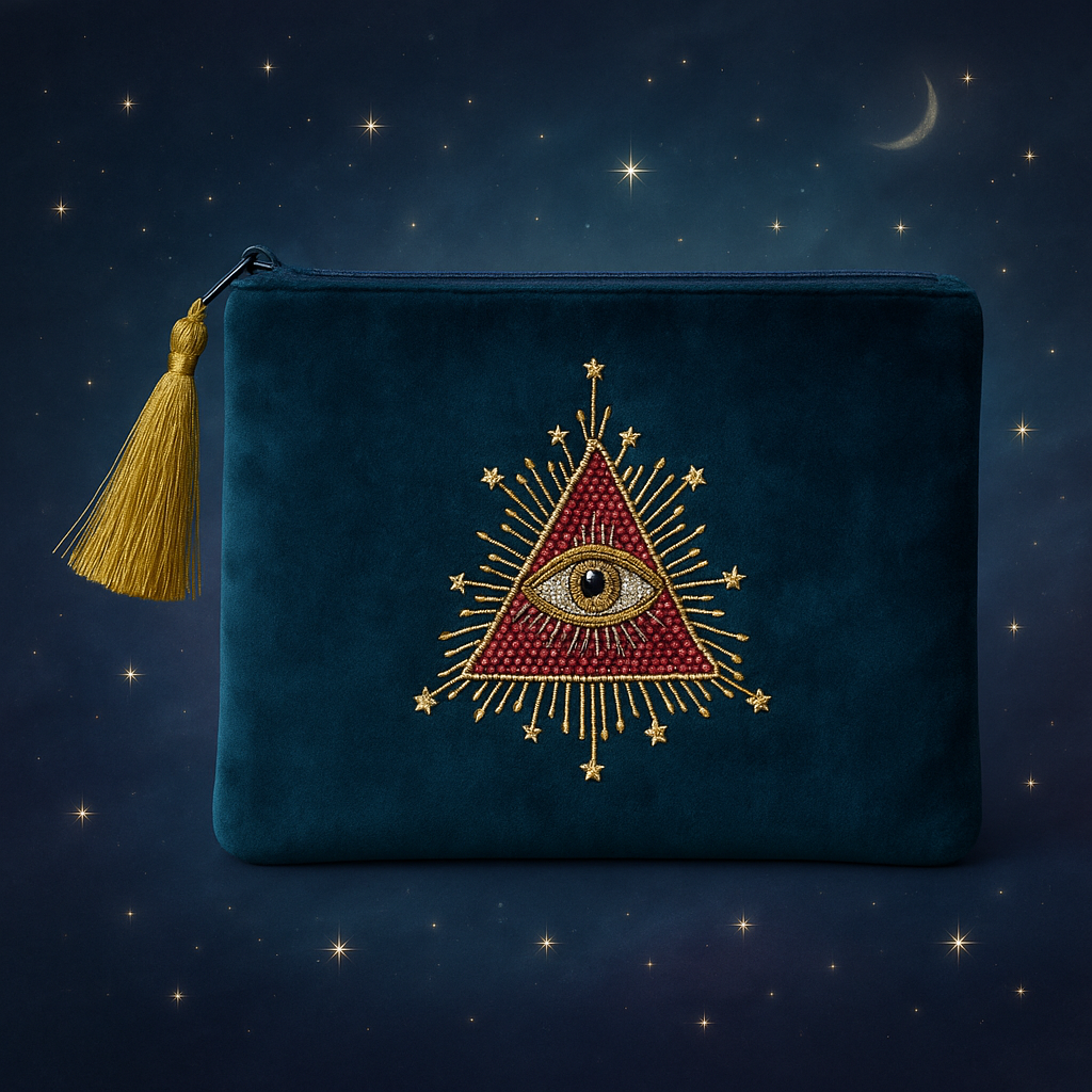 Dieses mystische Samt-Täschchen in tiefem Petrol ist der ideale Begleiter für unterwegs und Zuhause. Die aufwendige Stickerei des allsehenden Auges, umrahmt von goldenen Strahlen und feinen Details, macht es zu einem besonderen Schmuckstück mit spiritueller Symbolkraft.