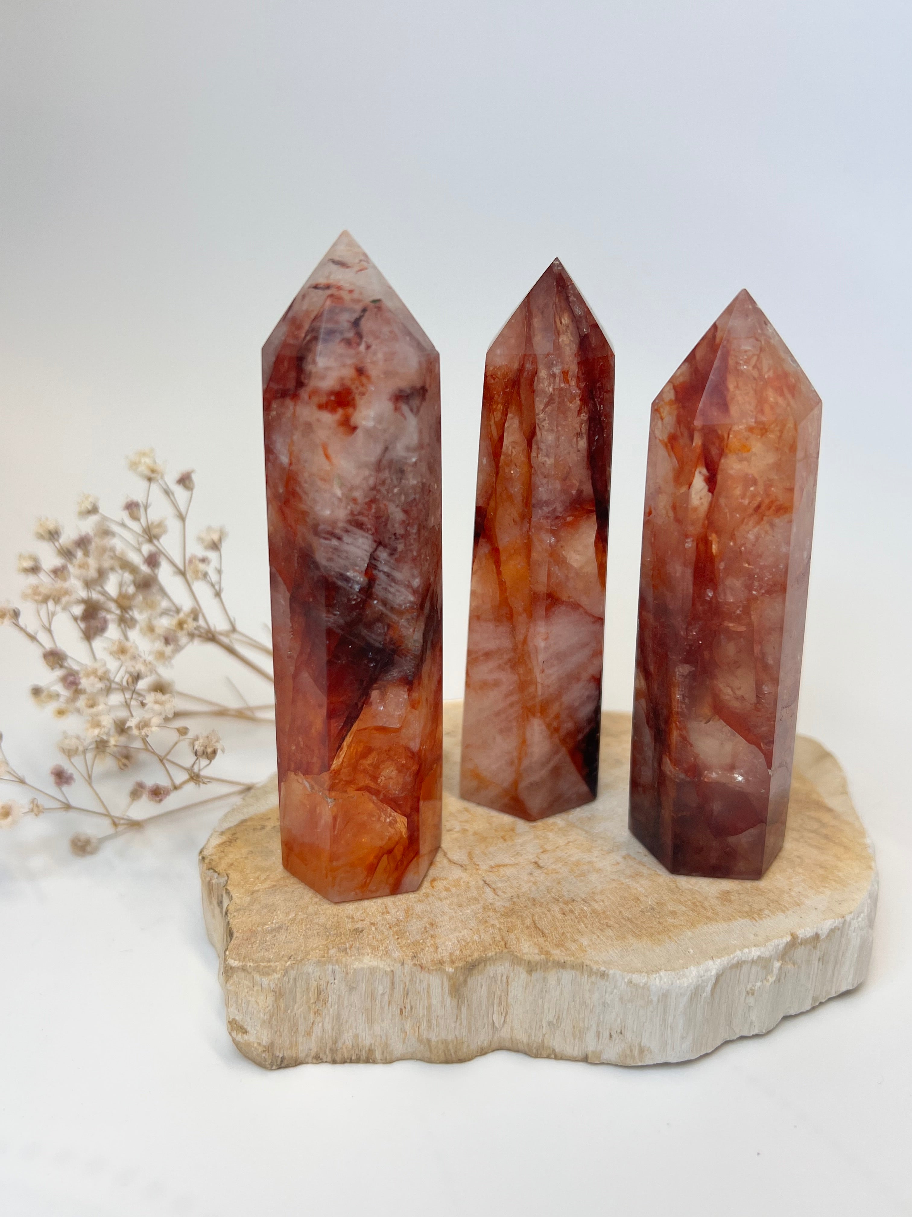 Dieser eindrucksvolle Turm aus Feuerquarz trägt die Energie reiner Lebenskraft in sich. Mit seinen rötlich-goldenen Adern und Einschlüssen wirkt er wie ein inneres Feuer – sanft glühend und doch voller Kraft. Er hilft dir, Altes zu verbrennen, Klarheit zu gewinnen und mit neuem Mut weiterzugehen.
