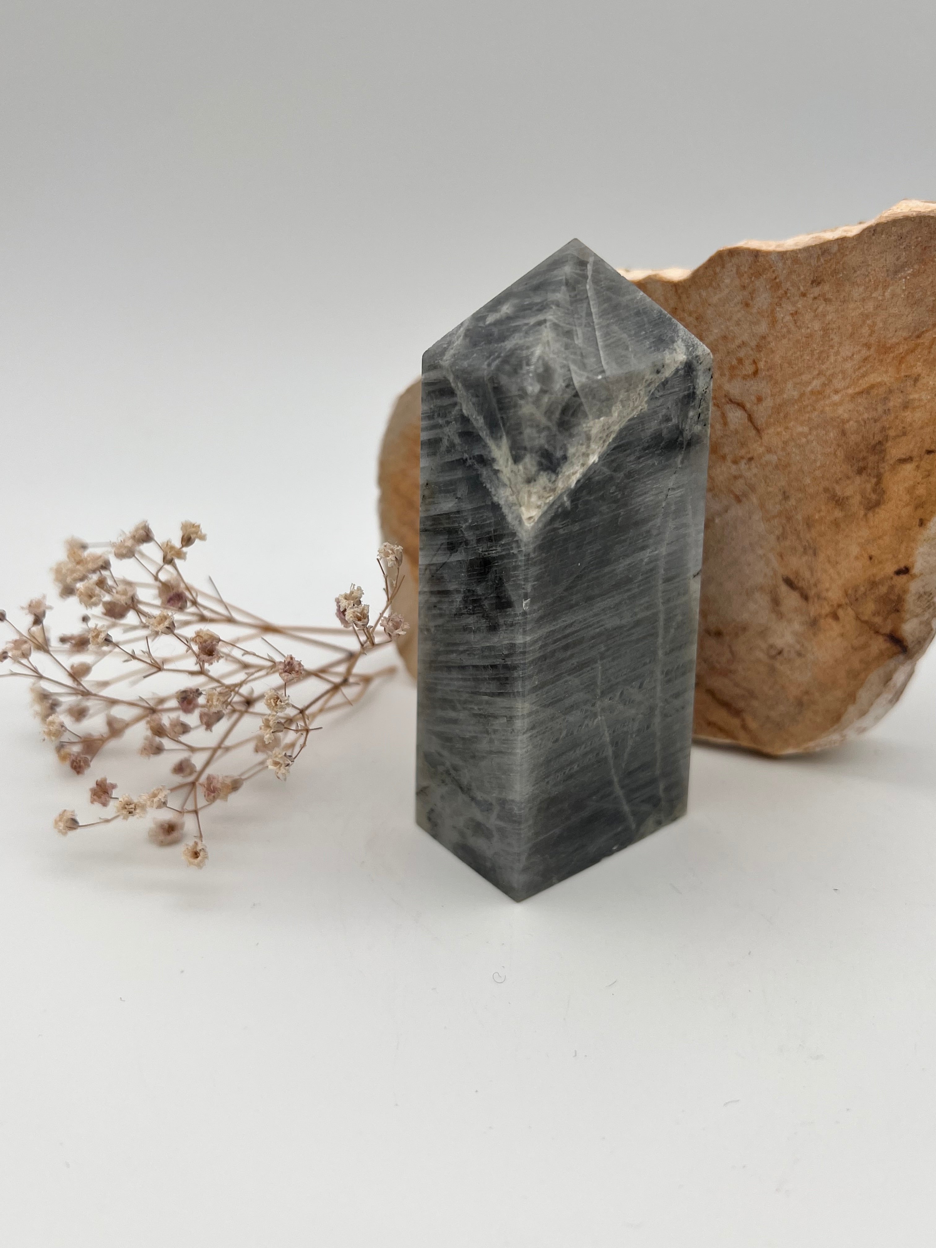Diese wunderschöne Labradorit-Spitze trägt die Magie des Nordlichts in sich: Ein tiefes, dunkles Grau durchzogen von geheimnisvollem Schimmer – wie geschaffen für alle, die mehr Intuition und Schutz in ihr Leben einladen möchten. Ob für dein Altar-Setup, deine Meditation oder einfach als kraftvolles Dekoelement – dieser Stein ist ein stilvoller Begleiter in deinem Alltag.