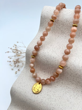 Der zart schimmernde Pfirsich-Mondstein symbolisiert weibliche Intuition, Selbstliebe und das innere Licht, das dich durch dunkle Zeiten führt. Er wirkt wie ein stilles Versprechen an dich selbst – dass du deiner Wahrheit folgen darfst.