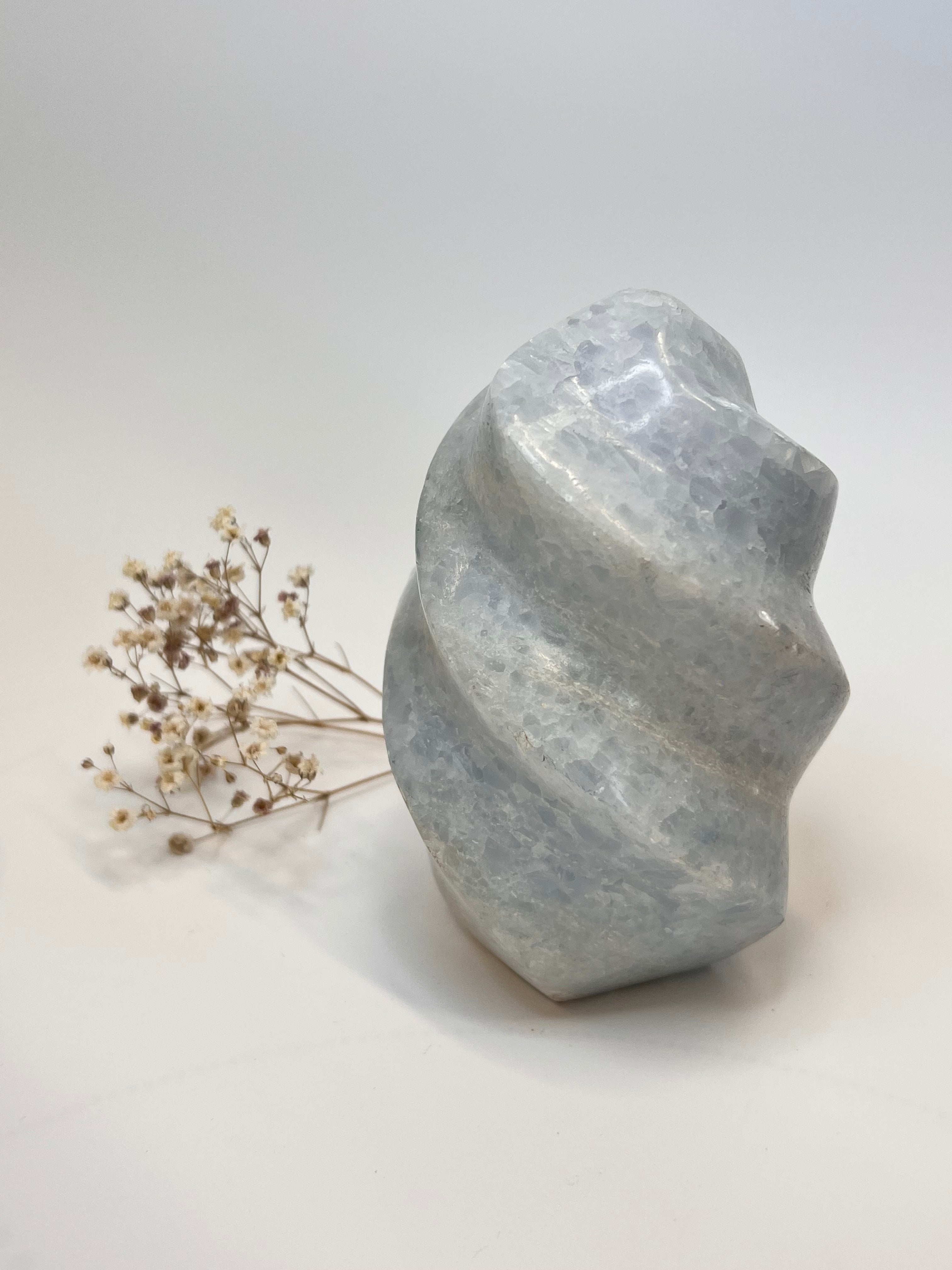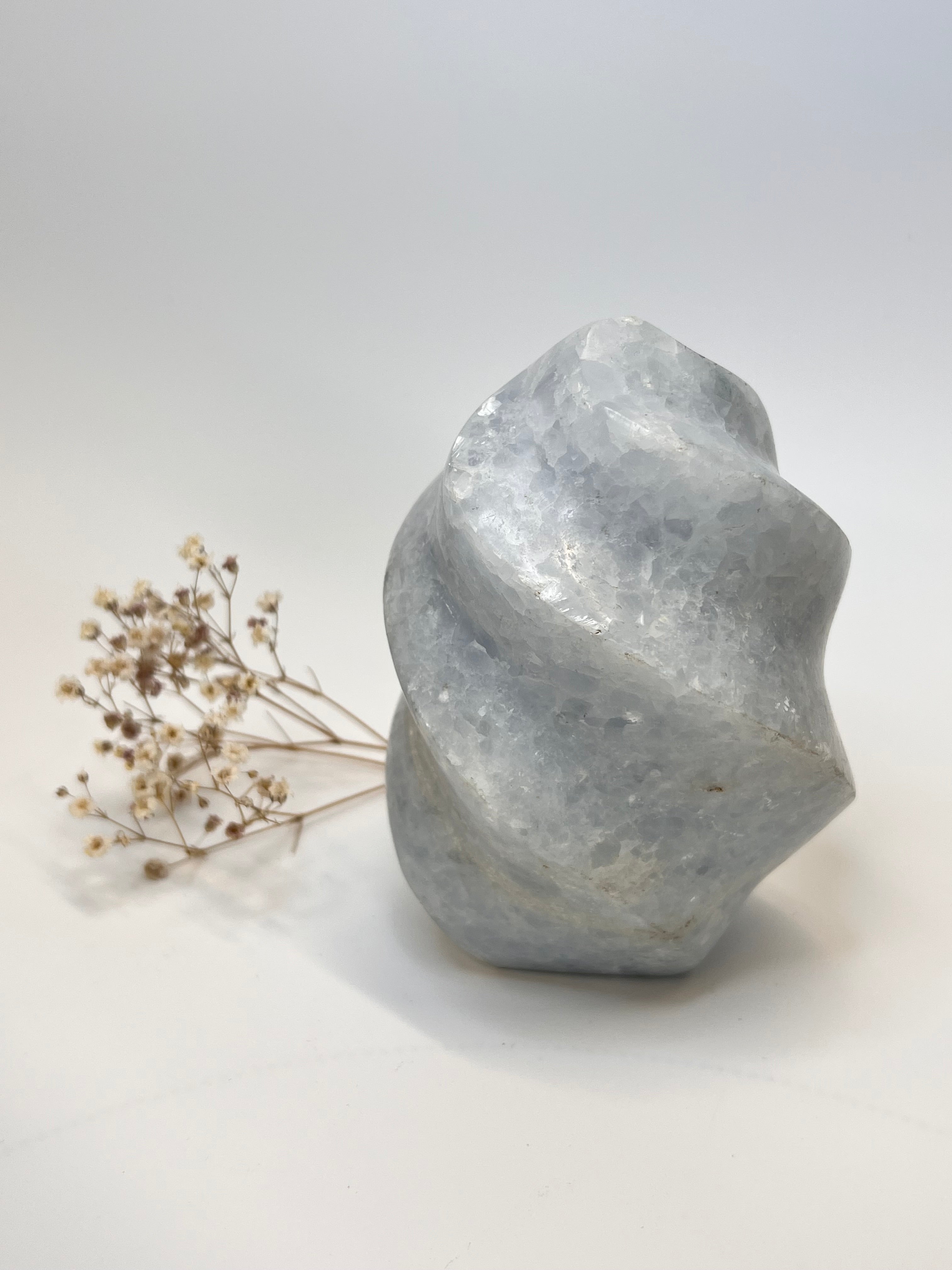 Coelestin gilt als Himmelsstein – er bringt Engelenergie, fördert tiefe Meditation und hilft dabei, innere Unruhe zu beruhigen. In der Form einer Flamme symbolisiert er die Rückkehr deines Lichts – nicht als wildes Feuer, sondern als stille, klare Präsenz. Ein idealer Stein für dein Schlafzimmer, deinen Altar oder Phasen der Rückverbindung.