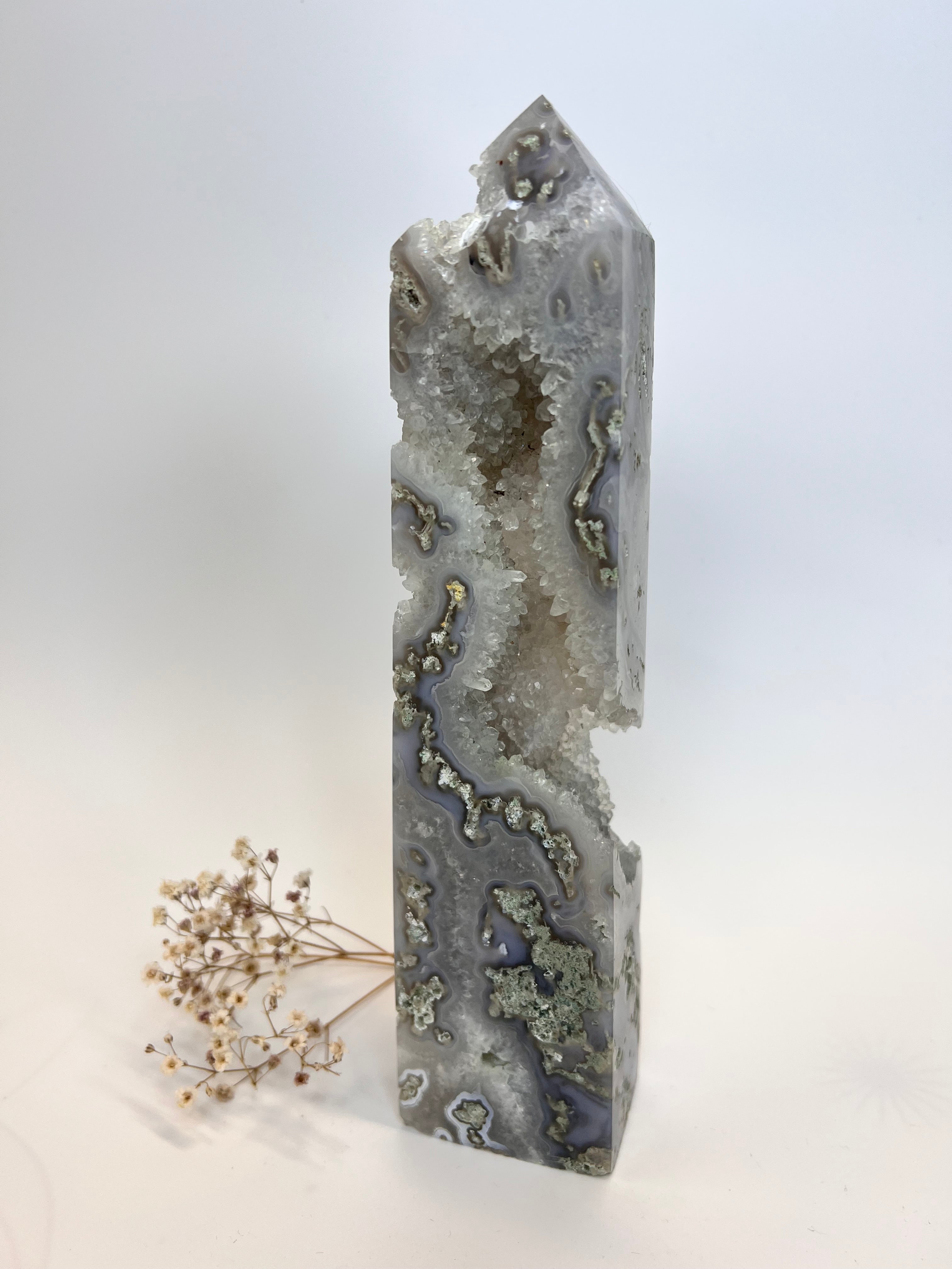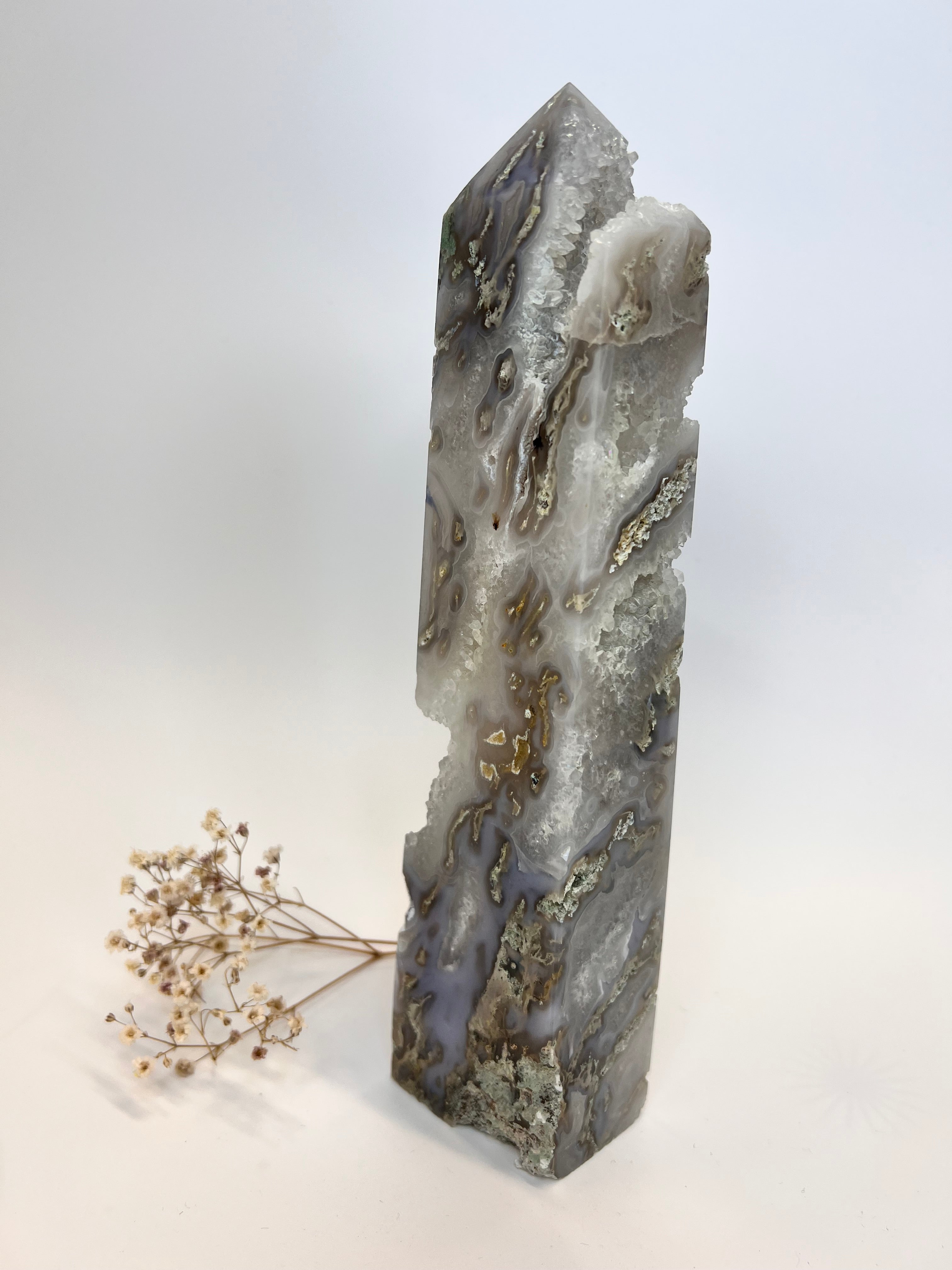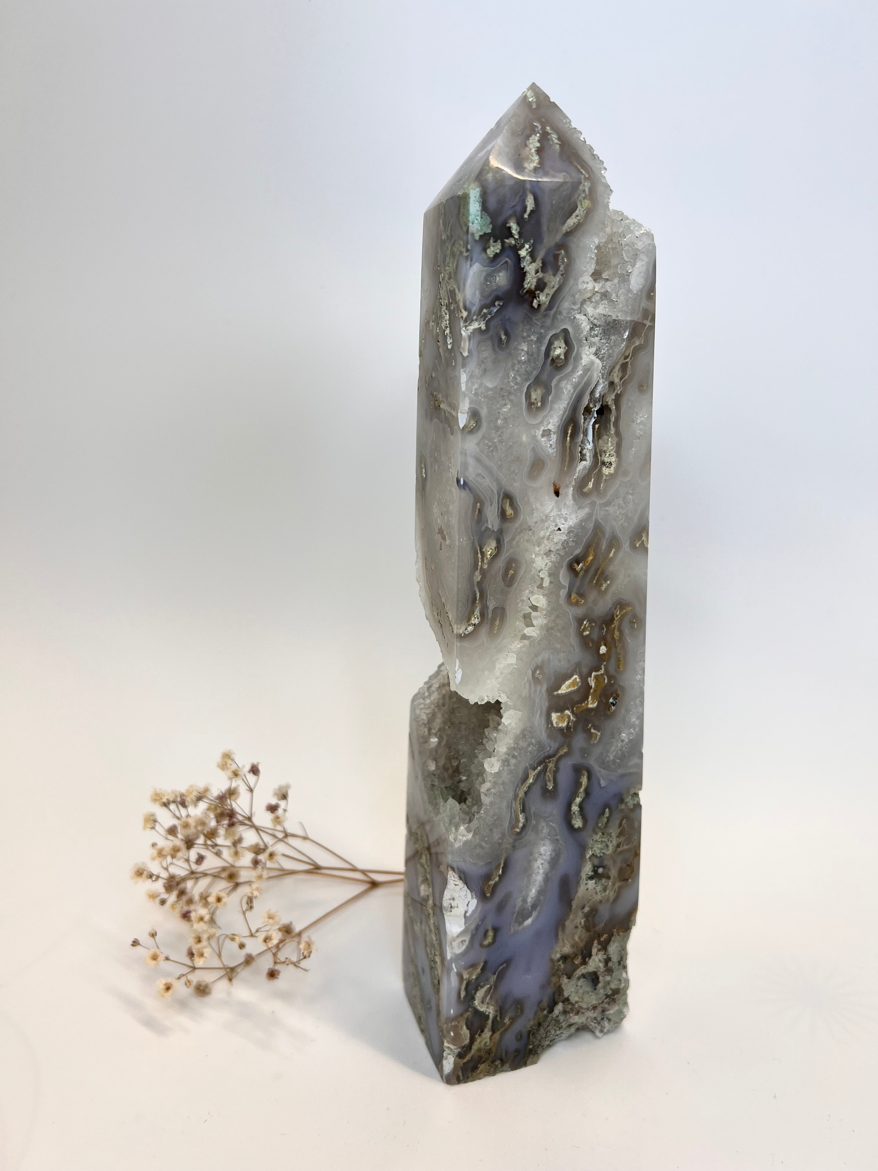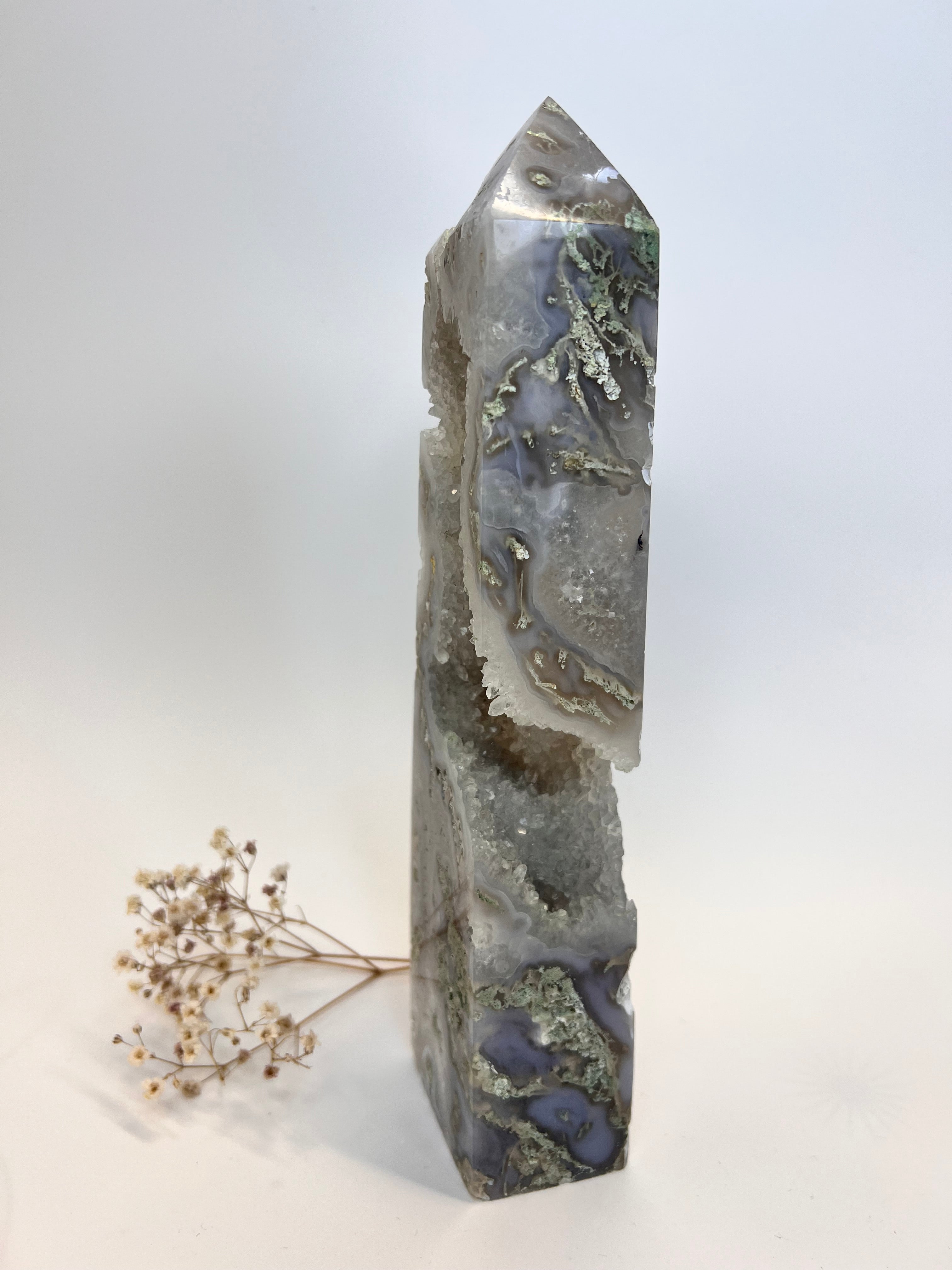 Dieser wunderschöne Moosachat Turm trägt die ruhige, nährende Energie des Waldes in sich. Seine moosartigen Einschlüsse wirken wie kleine Landschaften im Inneren des Steins – wie Pfade durch stilles Grün, wie das Flüstern alter Bäume in deinem Herzen.